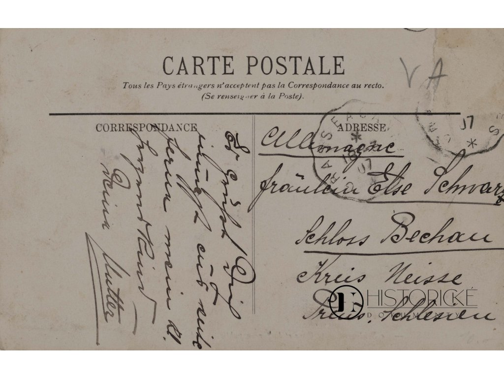 Korespondence psána francouzsky, obsahuje přátelské pozdravy z hlavního města Francie. Zámek Bechau, německy Schloss Bechau, náležel k panským sídlům slezské šlechty v kraji, jenž po válce druhé světové připadl Polsku. Pohlednice dokládá společenské vazby mezi aristokracií německou a prostředím pařížským v dobách před Velkou válkou. Poštovní razítko pařížské částečně čitelné, formulář standardní pro mezinárodní zásilky s poznámkou, že ne všechny země přijímají korespondenci na lícní straně. Papír zažloutlý, písmo zachovalé.