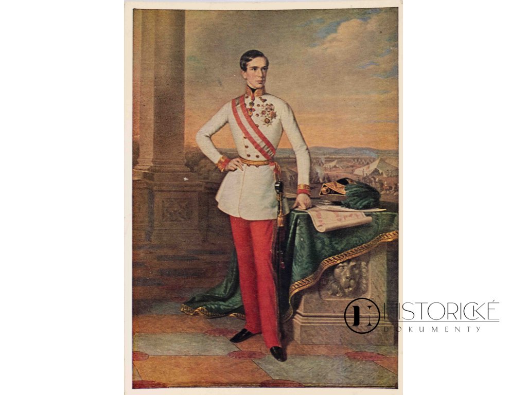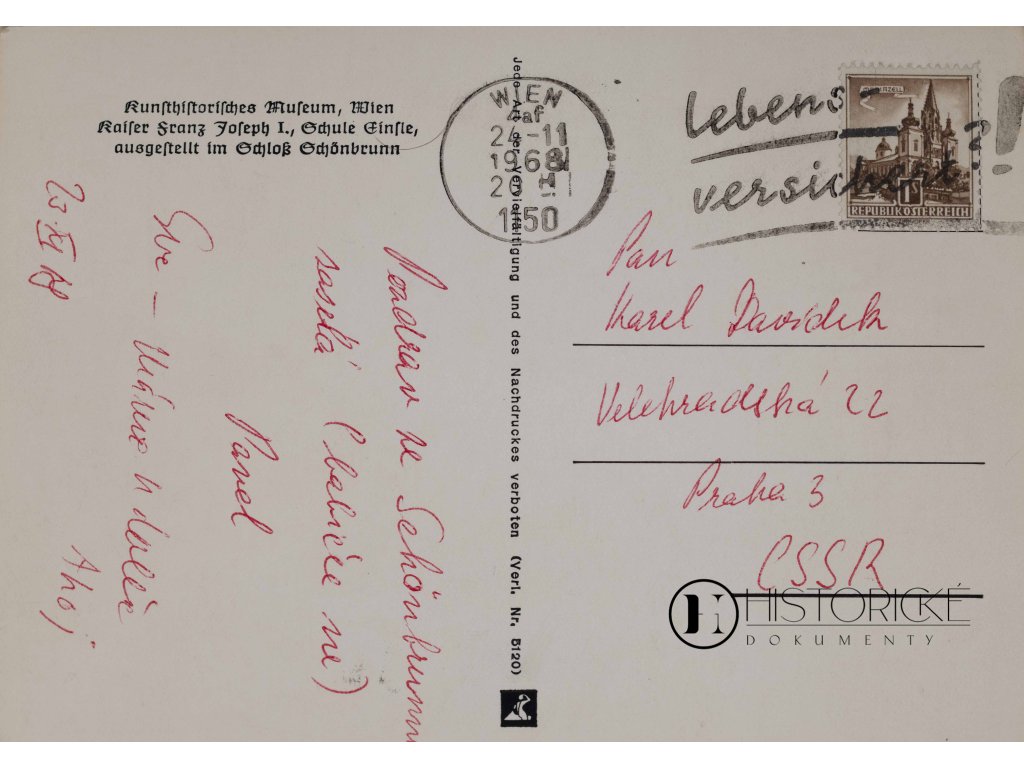 Pohlednice z Vídně císařské, zobrazující portrét Jeho Veličenstva císaře a krále Františka Josefa I., dle školy Einsleho, vystavený v zámku Schönbrunn a pocházející ze sbírek Uměleckohistorického muzea vídeňského. Lístek prošel poštou dne 24. listopadu léta 1968, opatřen jest známkou rakouskou s vyobrazením poutního chrámu v Mariazell a razítkem vídeňským. Adresováno panu Karlu Dvořákovi do Prahy 3, ulice Velehradská, v ČSSR. Text psán česky, pozdrav ze Schönbrunnu. Vzácná upomínka na monarchu nejdéle panujícího, jehož podobizna i po desetiletích poutala návštěvníky Vídně. Pro sběratele filokartie i ctitele mocnářství.