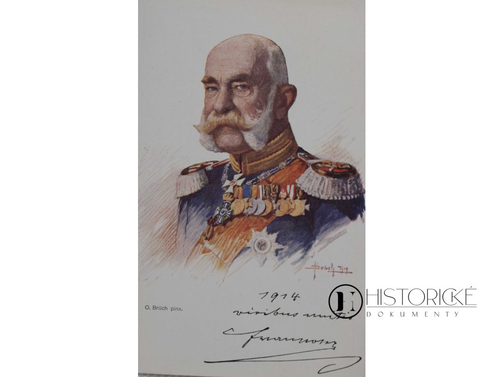 Pohlednice s podobiznou Jeho císařského a královského Apoštolského Veličenstva Františka Josefa I., mocnáře říše Rakousko-Uherské. Výtvarné dílo pochází z ateliéru umělce O. Brucha, jehožto štětec zachytil vznešenou tvář panovníkovu s věrností obdivuhodnou. Pohlednice zachovala se ve stavu nepopsaném, poštou neprošlém a bez známky, což svědčí o jejím výjimečném zachování. Karta tato představuje cenný doklad doby monarchie a jest vyhledávaným sběratelským artefaktem pro ctitele historie habsburské i milovníky dobové ikonografie císařské.