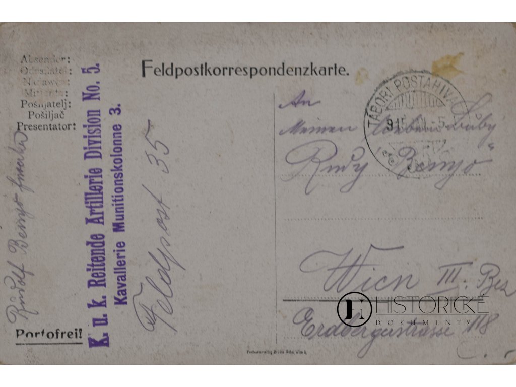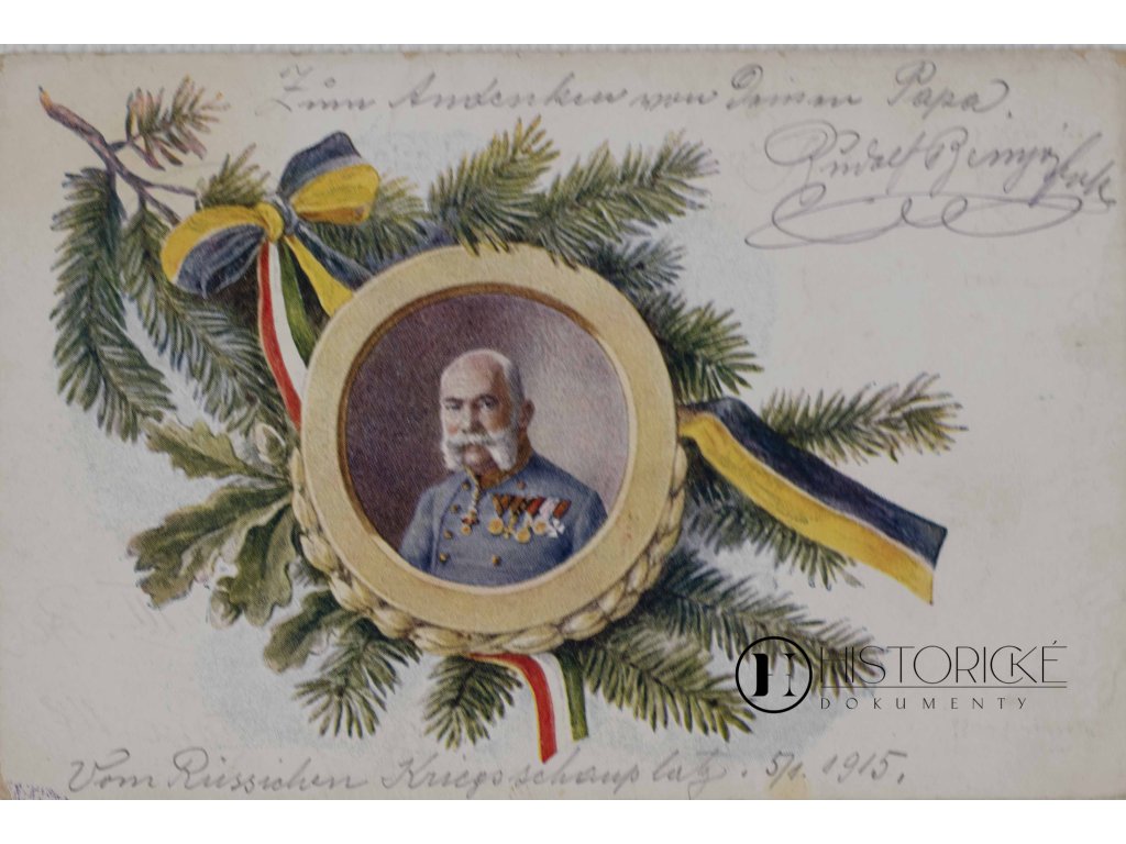 Vzácná polní pohlednice vánoční z léta válečného 1915 s portrétem Jeho Veličenstva císaře Františka Josefa I. Feldpostkorrespondenzkarte určená vojínům c. a k. armády v poli bojujícím. Pohlednice prošlá poštou polní, opatřena známkou řádnou a razítkem datovaným 15. ledna 1915. Nedepsaná, což zvyšuje cenu její sběratelskou. Dojemná památka na časy těžké Velké války, kdy mocnář sešlý věkem posílal pozdravy vánoční mužstvu věrnému na frontách dalekých. Klenot pravý pro milovníky memorabilií vojenských i monarchistických z dob slávy habsburské.