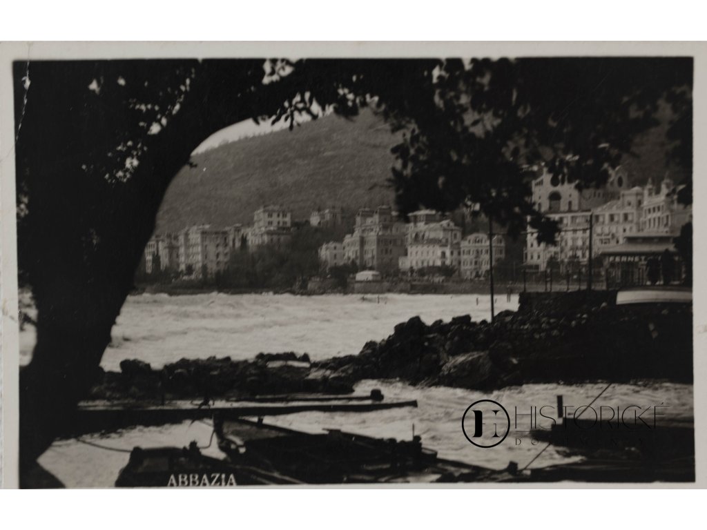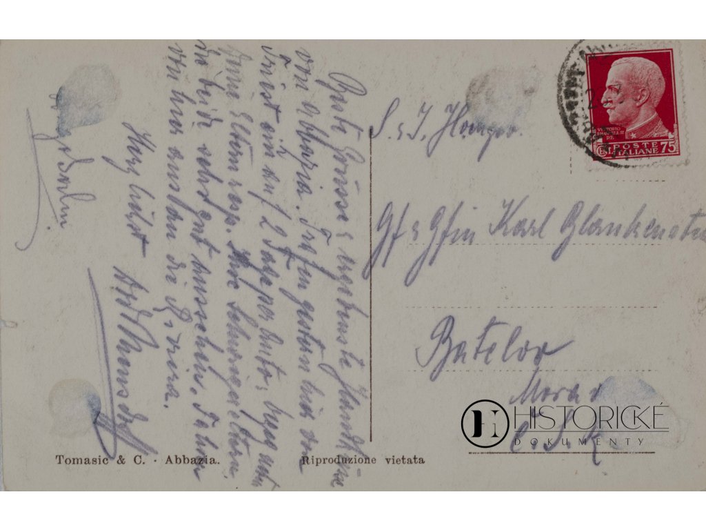 Vydavatelství Tomasic & C. Abbazia, s poznámkou Riproduzione vietata zakazující reprodukci. Opatřena italskou známkou 75 centesimi s portrétem krále Viktora Emanuela III., což datuje pohlednici do období italské správy Istrie mezi světovými válkami. Text psán německy v tónu přátelském, podepsán Albina či podobně. Abbazia bývala oblíbeným letoviskem středoevropské aristokracie, kam šlechta z Čech a Moravy jezdívala za sluncem a mořským vzduchem. Pohlednice nese stopy dotyků, avšak zůstává čitelná a kompletní.