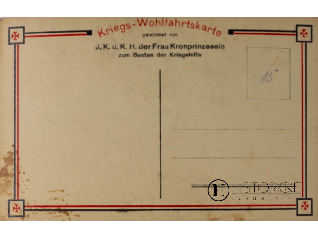 Převzácná německá dobročinná pohlednice z Velké války (Kriegs-Wohlfahrtskarte) věnovaná Jeho Císařské a Královské Výsosti paní korunní princezně k podpoře válečné pomoci. Na líci vyobrazena jest elegantní dáma v zahradním prostředí se slunečníkem a perlami, oblečená v dobové módě dvacátých let. Pohlednice č. 4572 vydaná nakladatelstvím NPG (Neue Photographische Gesellschaft) ve stylu fotografické secese. Na rubu spatřujeme červeno-bílou výzdobu s železnými kříži a označením "Zum Besten der Kriegshilfe". Pro sběratele válečných memorabilií i badatele v dějinách německého císařství předmět nadmíru zajímavý, jenž dokládá propagandistické úsilí a dobročinné aktivity za první světové války.
