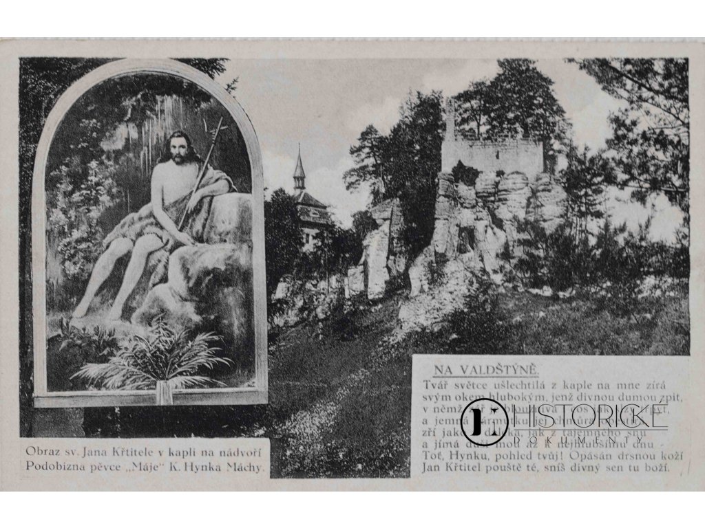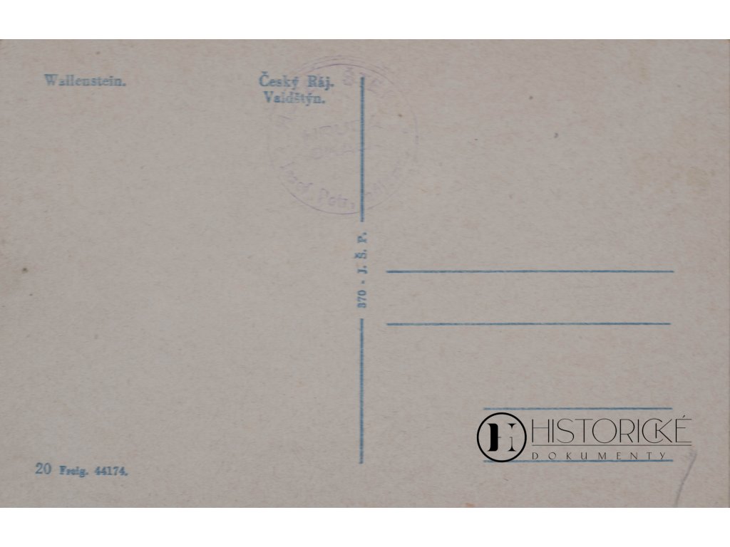 Pohlednice malebná zachycující zříceninu hradu Valdštýna v Českém ráji, perlou to kraje turnovského. Hrad tento, vystavěný ve 13. věku na skalách pískovcových mohutných, býval sídlem pánův z Valdštejna, z nichž slavný Albrecht vévoda frýdlantský pocházel. Pohlednice nadepsaná, leč poštou neprošlá, známkou neopatřená, avšak razítkem označená. Číslo 44174 svědčí o vydání hromadném pro potřeby turistův a výletníkův, kteří krásy Českého ráje obdivovati přicházeli. Skvostná památka z dob, kdy krajina podještědská cílem poutníkův romantických bývala