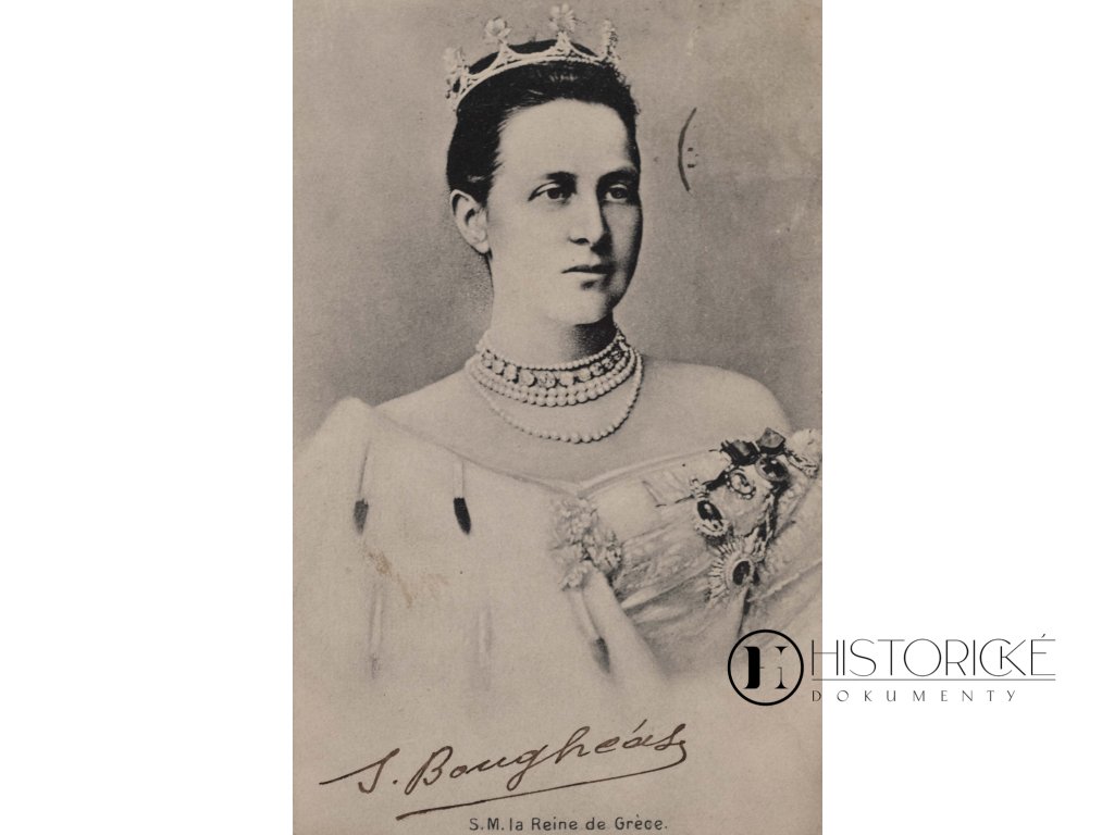 Portrét zachycuje královnu v diadému skvostném a náhrdelníku perlovém víceřadém. Podpis fotografa J. Boughéase. Rub nese hlavičku řeckou i francouzskou Světového poštovního spolku, adresováno panu Karlu Appeltovi do Prahy II, Čechy. Text psán rukou. Královna Olga proslula dobročinností svou i založením nemocnic. Vzácná pohlednice prošlá z Řecka do Čech pro sběratele filokartie, ctitele monarchií evropských i poštovní historie.