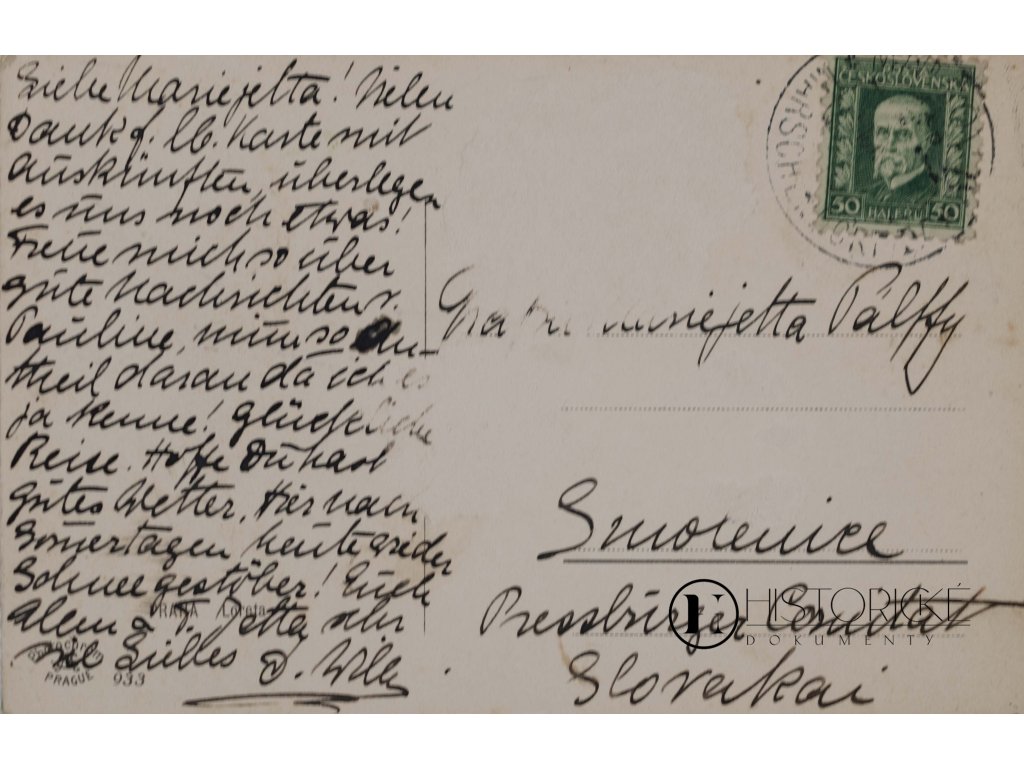 Psáno v jazyce německém, text obsahuje přátelské zprávy a přání šťastné cesty, zmínka o počasí a sněhové vánici po svátcích. Pohlednice opatřena československou známkou 50 haléřů s podobiznou presidenta T. G. Masaryka, odesláno z Prahy. Poštou řádně prošlá. Dokument tento jest cenným svědectvím společenského styku uherské aristokracie v dobách republiky československé.