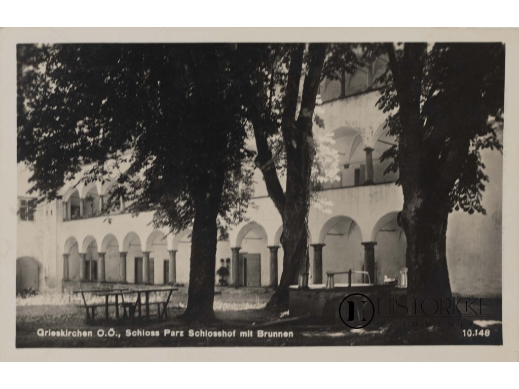 Na aversu jest zobrazen zámek Parz v Grieskirchen, Horní Rakousy, s nádvořím a kašnou. Pohlednice opatřena rakouskou známkou v hodnotě 10 grošů, poštou řádně prošlá. Rukopisný text v jazyce německém svědčí o společenském styku aristokracie v dobách meziválečných, léta Páně 1930. Dokument tento jest cenným artefaktem pro badatele dějin šlechtických i sběratele poštovní historie.