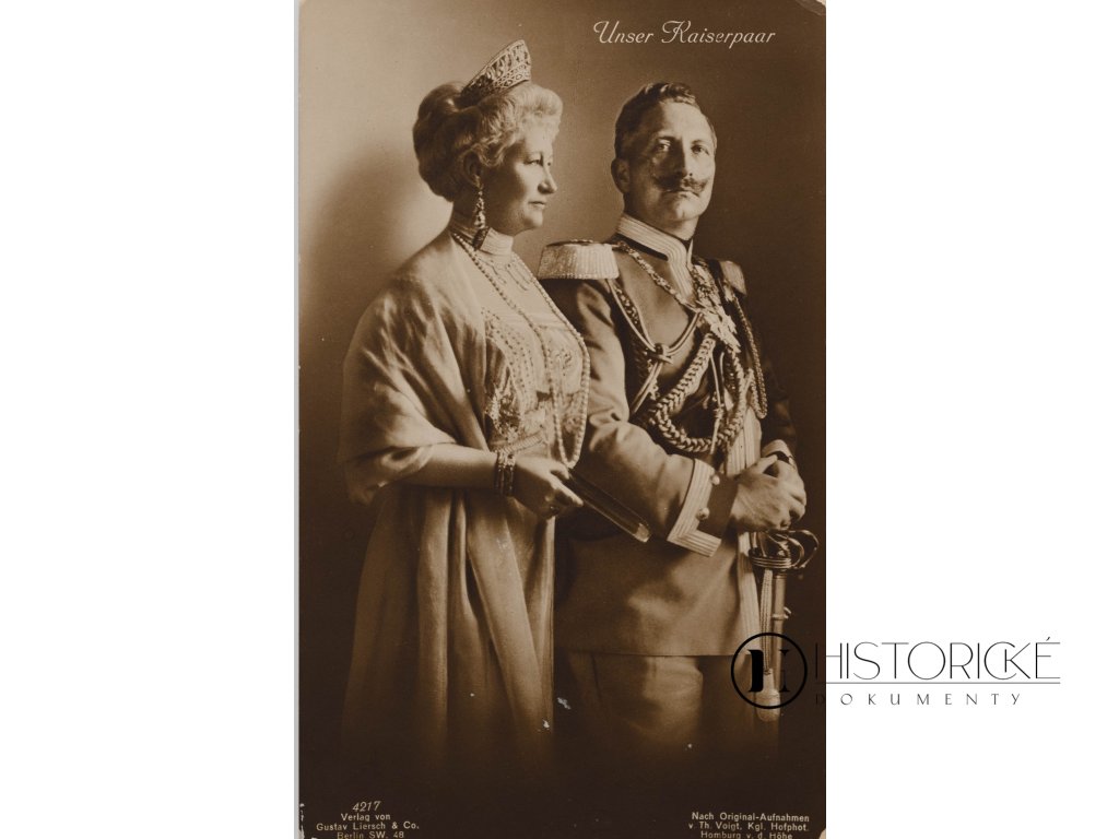 Historická pohlednice kaisera Viléma II. Pruského s chotí s německým nápisem "Unser Kaiserpaar" (Náš císařský pár), číslo 4217, vydaná firmou Gustav Liersch & comp. v Berlíně. Kartička jest nadepsaná a prošlá poštou, ale bez známky. Pohlednice zobrazuje posledního německého kaisera s jeho manželkou Augustou Viktorií a představuje autentickou memorabilii Německého císařství z období před první světovou válkou. Jedná se o kvalitní berlínskou produkci zachycující císařský pár v reprezentativním provedení. Neocenitelná památka pro sběratele německých královských pohlednic a milovníky hohenzollernské dynastie. Výtečný dokument německého císařského kultu.