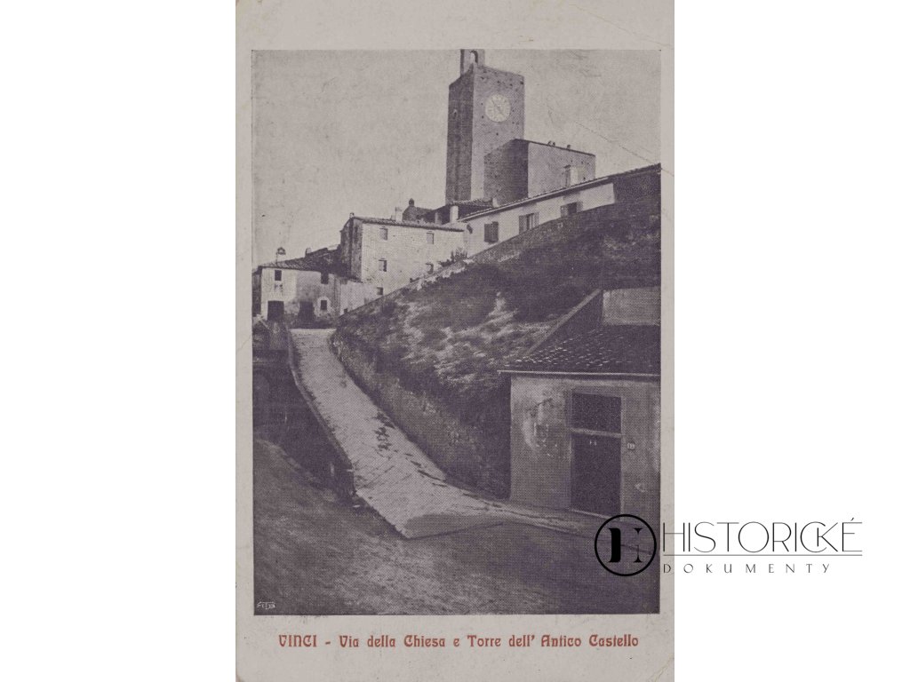 Záběr zachycuje Via della Chiesa, totiž ulici Kostelní, a věž starého hradu, Torre dell'Antico Castello, s hodinami na průčelí. Městečko malebné na svazích kopců toskánských uchovává památku na syna svého nejslavnějšího, malíře, sochaře, architekta i vynálezce, jehož jméno celý svět zná. Domy kamenné a ulička stoupající k hradu středověkému připomínají doby, kdy Leonardo zde léta Páně 1452 se narodil. Pohlednice tónovaná, stav zachovalý. Vzácná upomínka pro milovníky Itálie a renesance.