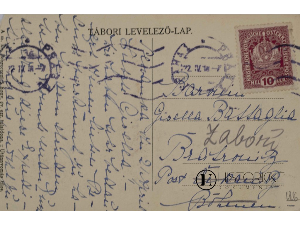 Zásilka jest hustě popsána vlastnoručním písmem a adresována slečně Giselle Battaglii do Záboří u Brodce, pošta Leraub, v Čechách. Italsky znějící příjmení adresátky v srdci Čech jest samo o sobě svědectvím o pestrém národnostním životě monarchie. Polní lístky z front velké války, psané s naléhavostí a vroucností vojákova srdce, jsou dnes sběratelsky i lidsky dokumenty nejvzácnějšího a nejdojemnějšího druhu.