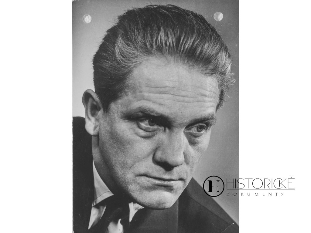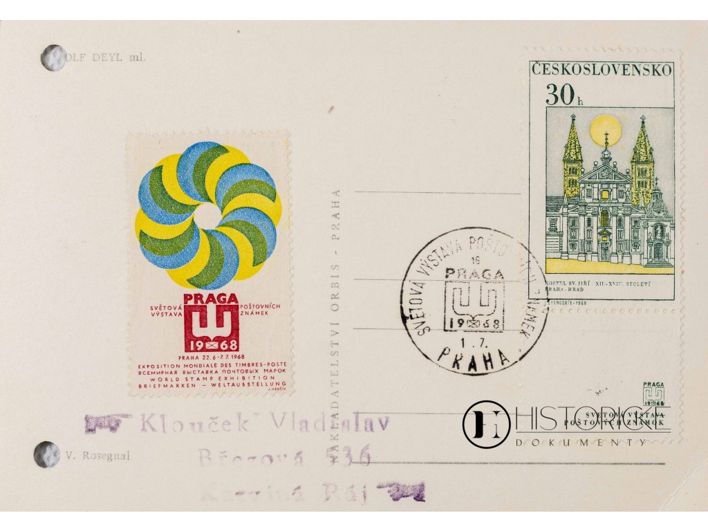 Pohlednice Rudolfa Deyla ml., vyrobená jako pressfoto fotografem Vilémem Rosegnalem. Kartička jest nadepsaná a prošlá poštou se známkou a příležitostným razítkem "Světová výstava známek 1968". Rudolf Deyl ml. (1912-1977) byl významný český herec, jenž proslul zejména rolemi ve filmech "Starci na chmelu" a dalších československých snímcích. Syn slavného herce Rudolfa Deyla st. se stal oblíbenou postavou české kinematografie. Pohlednice z roku 1968 zachycuje období jeho vrcholné kariéry. Zajímavá memorabilia pro sběratele českých hereckých osobností kombinovaná s filatelistickým zájmem o světovou výstavu známek.