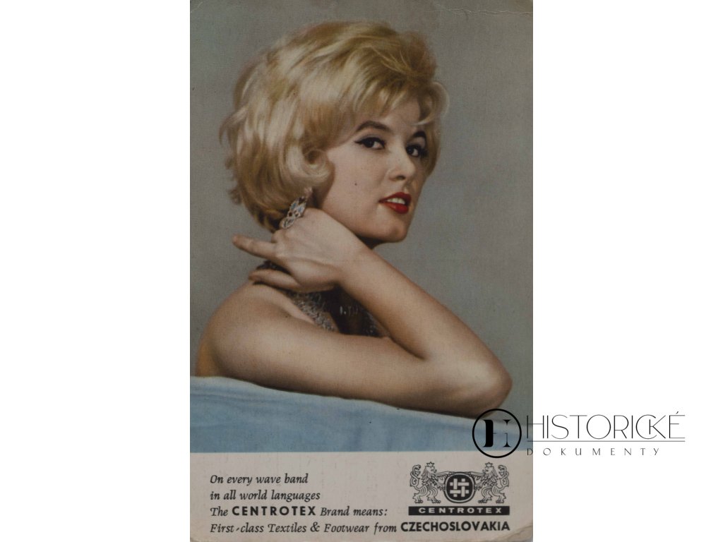 Reklamní pohlednice proslulého podniku zahraničního obchodu Centrotex, jenž býval za časův republiky Československé předním vývozcem textilií domácích do zemí všech světadílův. Pohlednice nadepsaná, leč poštou neprošlá, známkou neopatřená. Centrotex, založený léta Páně 1945, sprostředkovával obchody s plátny českými, sukny moravskými i krajkami slovenskými po celém světě známými. Vzácný doklad obchodní slávy průmyslu textilního československého, jenž potěší sběratele memorabilií kupeckých i milovníky historie hospodářské naší vlasti.