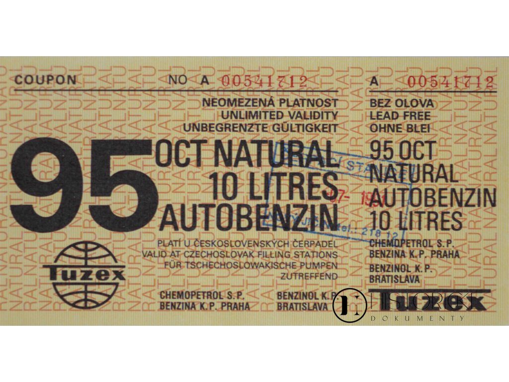 Poukázka na 10 litrů benzinu oktanového čísla 96, podnikem zahraničního obchodu Tuzex vydaná, číslem Poukázka na benzin, Tuzex, (A005), 10 l opatřená. Jest to artefakt nadmíru cenný, dokumentující systém prémiového prodeje pohonných hmot v době socialistické. Dokument tento poskytuje vzácné svědectví o způsobech nákupu za tuzexové bony a zvláštním postavení Tuzexu.