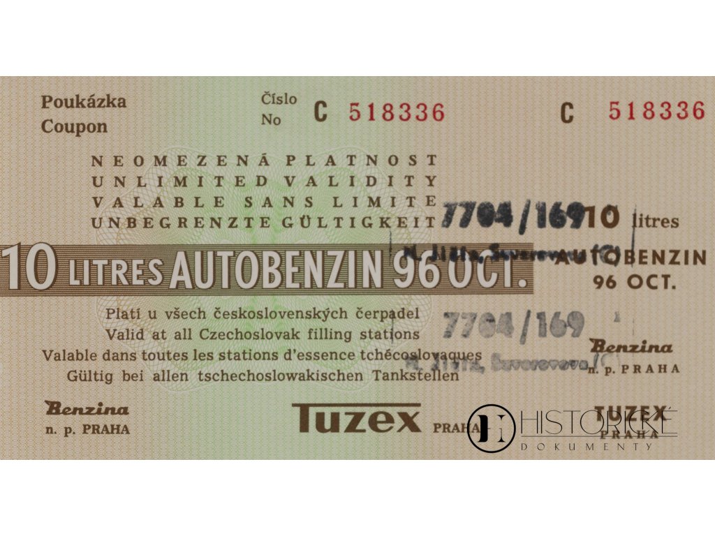Poukázka na 10 litrů benzinu oktanového čísla 96, podnikem zahraničního obchodu Tuzex vydaná, číslem B 518336 opatřená. Jest to artefakt nadmíru cenný, dokumentující systém prémiového prodeje pohonných hmot v době socialistické. Dokument tento poskytuje vzácné svědectví o způsobech nákupu za tuzexové bony a zvláštním postavení Tuzexu.