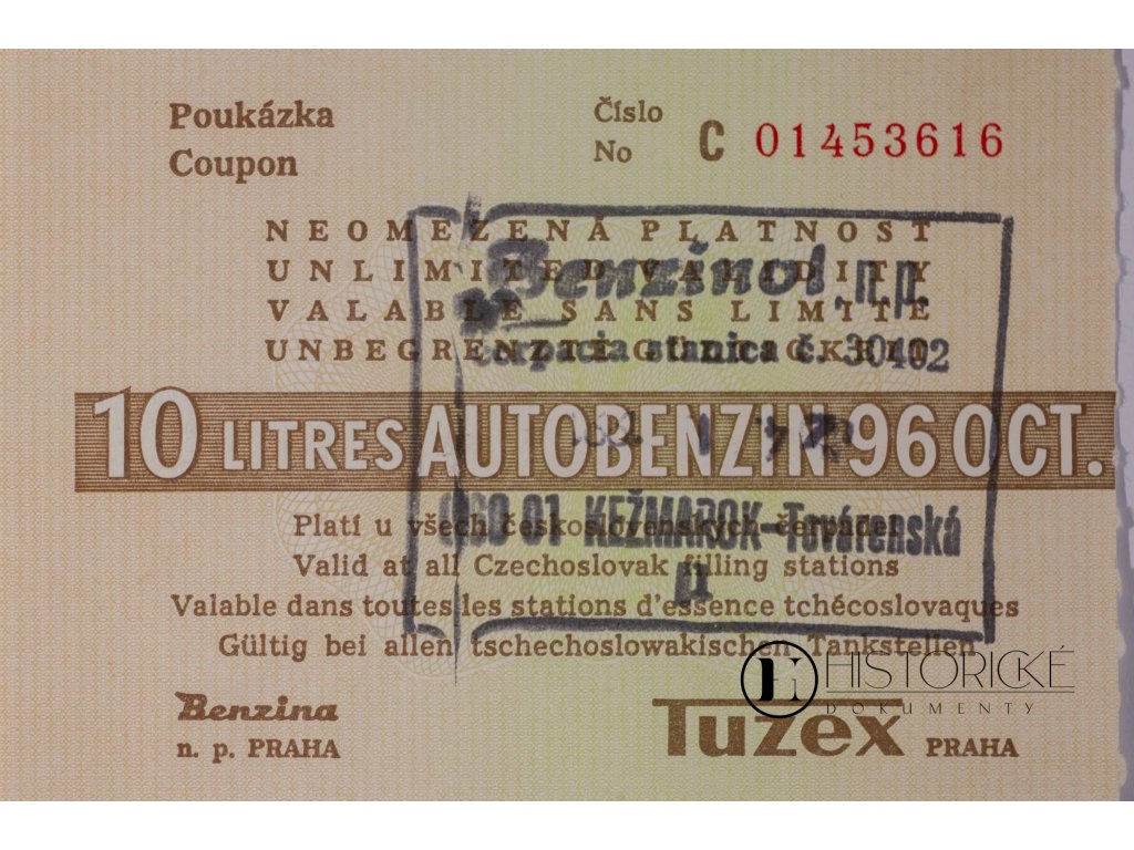 Poukázka na 10 litrů benzinu oktanového čísla 96, podnikem zahraničního obchodu Tuzex vydaná, číslem C 01453616 opatřená. Jest to artefakt nadmíru cenný, dokumentující systém prémiového prodeje pohonných hmot v době socialistické. Dokument tento poskytuje vzácné svědectví o způsobech nákupu za tuzexové bony a zvláštním postavení Tuzexu.