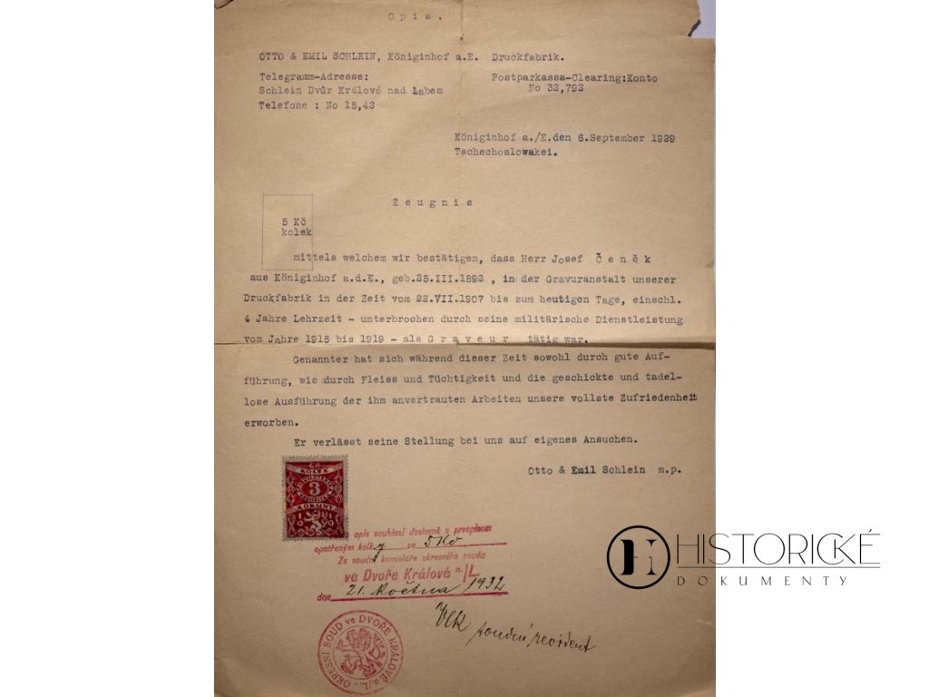 Unikátní pracovní vysvědčení vydané firmou Otto & Emil Schlein, tiskárna ve Dvoře Králové nad Labem, ze dne 6. září 1939. Dokument je vystaven pro Josefa Čeňka, který v tiskárně pracoval jako rytec v letech 1907-1919 (s přerušením kvůli vojenské službě 1915-1919). Obsahuje kolek v hodnotě 5 Kčs a úřední razítko. Cenný dokument dokumentující pracovní poměry v českém pohraničí před začátkem druhé světové války.