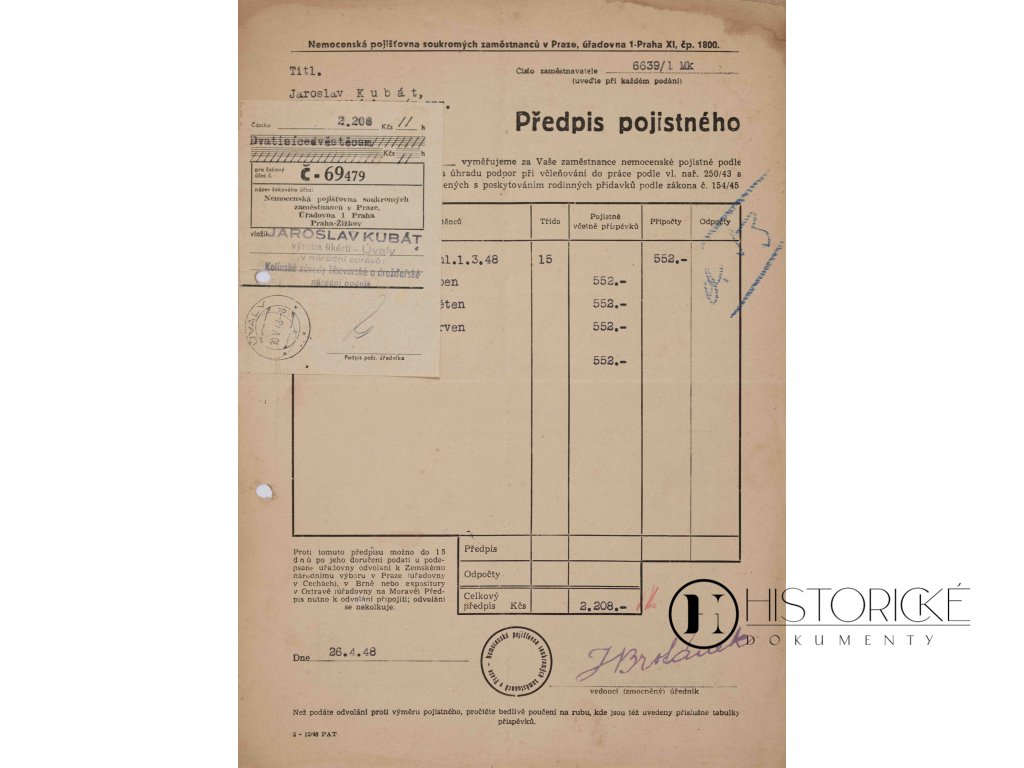 Předpis pojistného Nemocenské pojišťovny soukromých zaměstnanců v Praze, vystavený dne 26. dubna roku 1948. Pojišťovna tato pečovala o zdraví a sociální zabezpečení úředníků, obchodních příručích a dalších zaměstnanců soukromého sektoru, jejichž postavení lišilo se od dělnictva továrního. Duben 1948 spadá do měsíců bezprostředně následujících po únorovém převratu komunistickém, kdy se schylovalo ke znárodnění pojišťoven a jejich sloučení v jednotný systém státní. K předpisu přiložena poštovní složenka pro úhradu pojistného, dokládající běžnou praxi inkasní. Dokumenty zachovány kompletní, formuláře tištěné s vyplněnými údaji. Vzácný doklad pojišťovnictví z přelomového roku dějin československých.