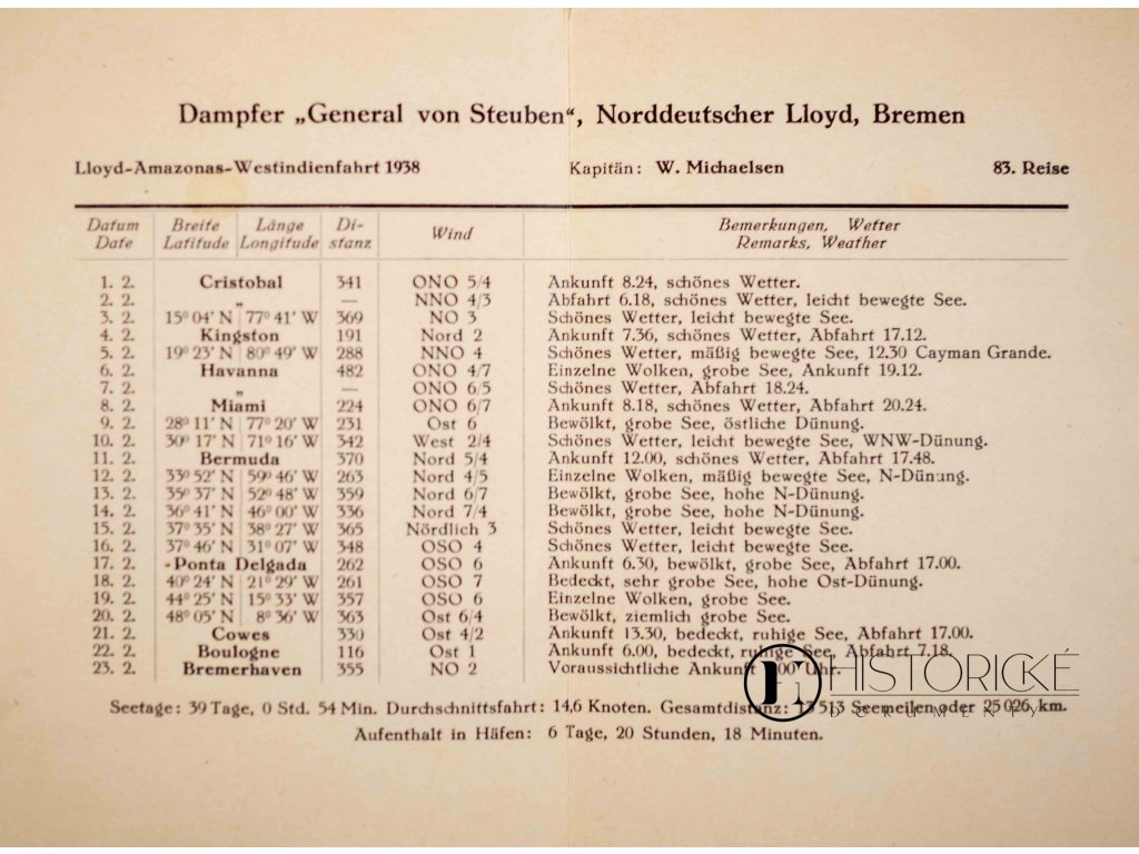 Doklad námořní historie – stránka z lodního deníku parníku „General von Steuben" Norddeutscher Lloyd Bremen z roku 1938. Zachycuje 83. plavbu na trase Lloyd-Amazonas-Westindienfahrt pod velením kapitána W. Michaelsena. Od 1. do 23. února léta Páně 1938 podrobně zaznamenává každodenní zeměpisnou polohu, směr větru, stav moře a příjezdy do přístavů Cristobal, Kingston, Havanna, Miami, Bermuda a dalších. Celková plavba trvala 30 dní a pokryla vzdálenost 13 513 námořních mil. Vzácný dokument předválečné námořní dopravy.
