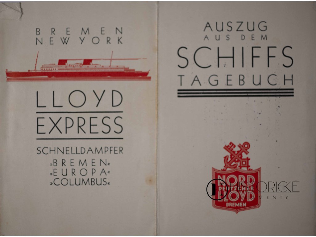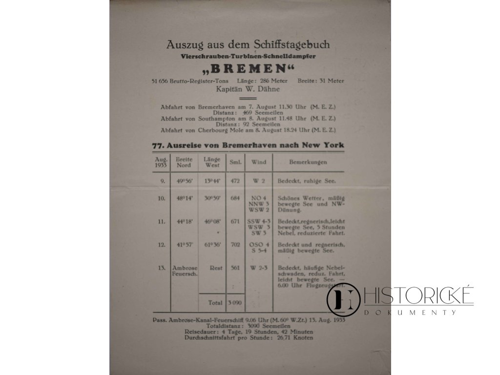 Propagace, výpis z lodního deníku čtyřšroubového turbínového rychloparníku BREMEN společnosti Norddeutscher Lloyd z jeho 77. plavby do New Yorku v srpnu 1933. Jest to dokument nadmíru cenný, obsahující přesné záznamy o poloze, počasí a plavebních podmínkách pod velením kapitána W. Dähneho. Artefakt tento dokumentuje zlatou éru zaoceánské dopravy před druhou válkou světovou.