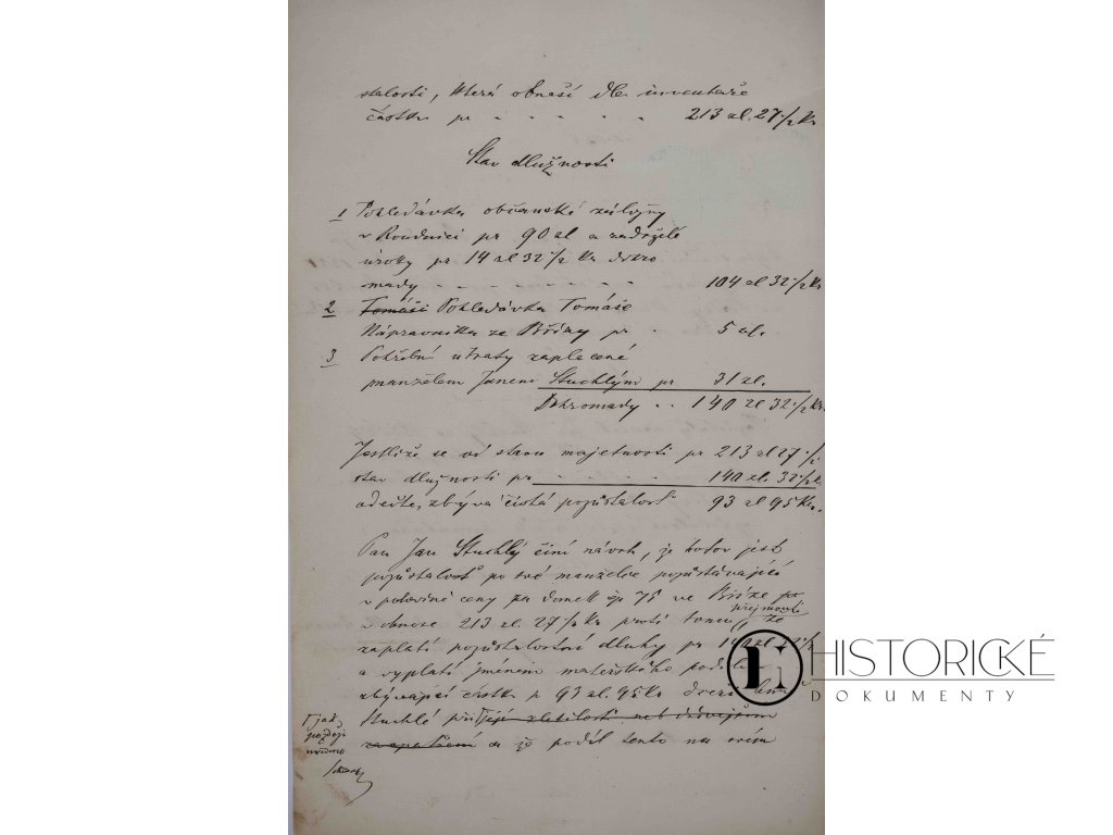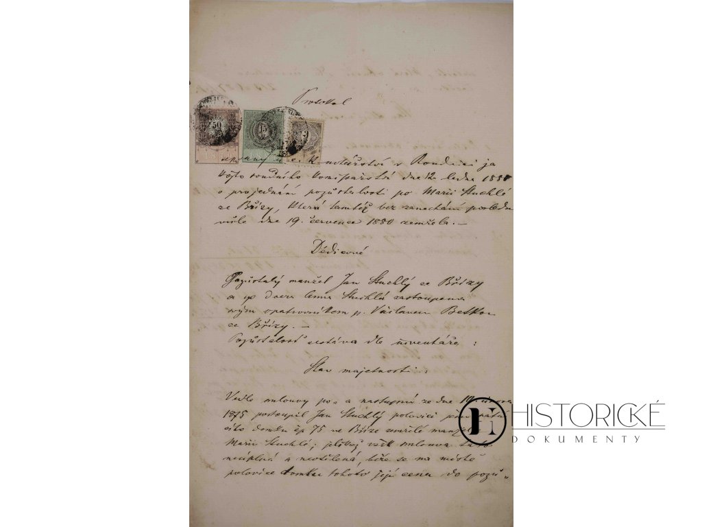 Text popisuje okolnosti úmrtí a další administrativní postupy. Jedná se o autentický pramen rakouské soudní a matriky administrativy z 19. století. Kombinace několika kolkových známek svědčí o úředním charakteru dokumentu. Neocenitelný materiál pro badatele rakouského práva, genealogického bádání a filatelisty. Zajímavá kombinace právního dokumentu a významného filatelistického materiálu.