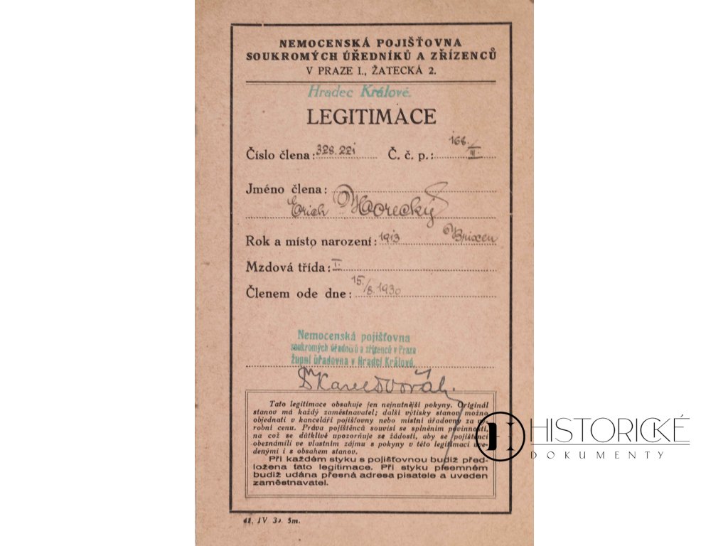 Průkaz členský Nemocenské pojišťovny soukromých úředníků a zřízenců v Hradci Králové, městě královském při soutoku Labe s Orlicí, vydaný dne 15. května léta 1930. Knížečka čítá dvanáct stran a obsahuje údaje o pojištěnci, záznamy o platbách příspěvků i nároku na dávky v nemoci. Pojišťovny nemocenské pečovaly o zdraví pracujícího lidu, neboť úředníci a zřízenci, an onemocněli, bez mzdy by zůstali a rodiny jejich v nouzi upadly. Hradec Králové, centrum kraje východočeského, měl institucí takových několik. Vzácná památka na sociální péči prvorepublikovou, svědectví o pojišťovnictví a životě úřednického stavu za první republiky Československé.