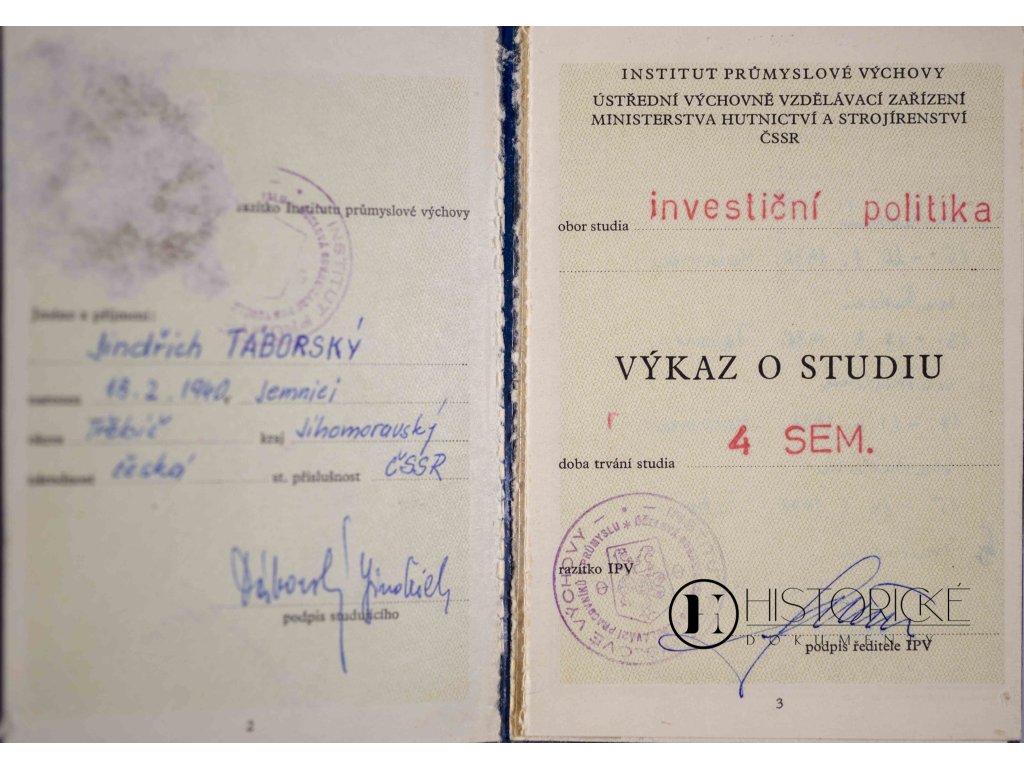 Studijní dokument z období socialismu - výkaz o studiu na Institutu průmyslové výchovy, obor Investiční politika, z roku 1978. Jest vázán v tvrdých deskách a obsahuje záznamy o průběhu studia. Tento dokument představuje cenné svědectví o systému vzdělávání průmyslových kádrů v období normalizace a dokládá způsob přípravy vedoucích pracovníků v československém hospodářství.
