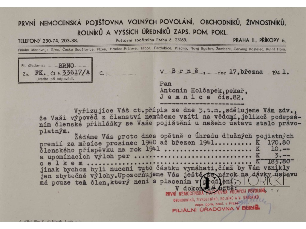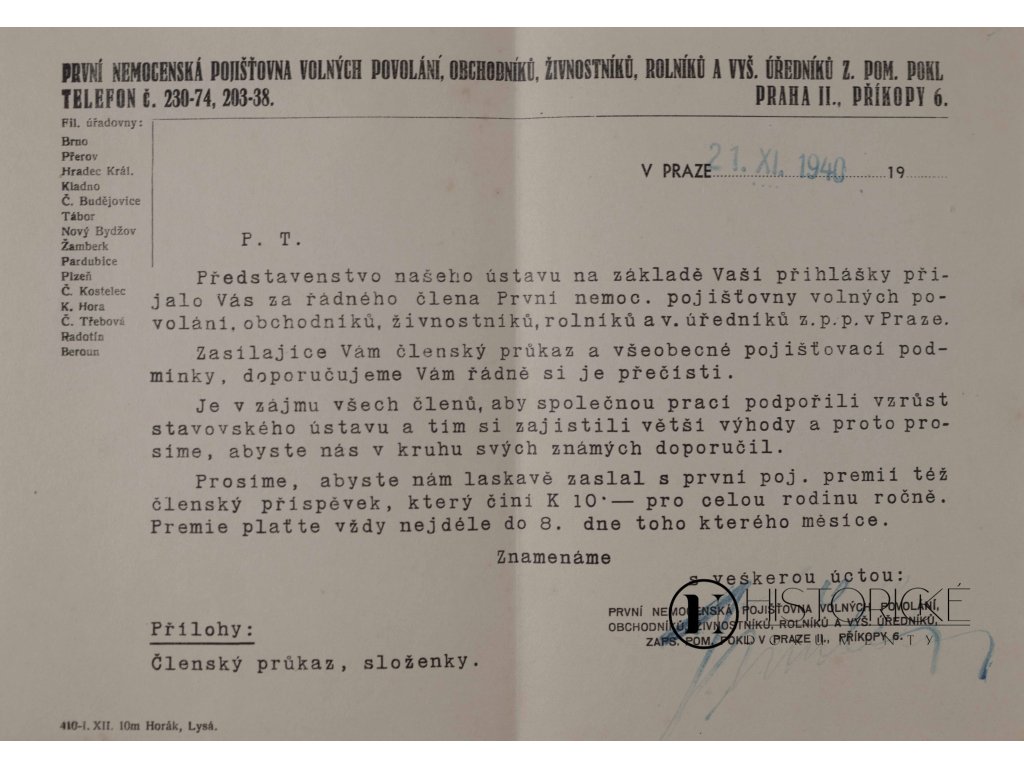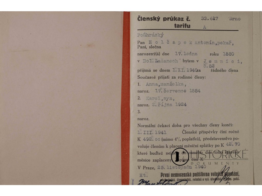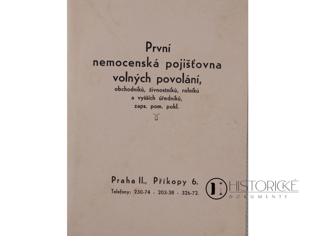 Historický členský průkaz První nemocenské pojišťovny volných povolání ze dne 20. listopadu 1940 s přiloženými Všeobecnými pojišťovacími podmínkami a dalšími dokumenty (celkem 4 kusy). Jedná se o autentický dokument z oblasti československého pojišťovnictví z období protektorátu, jenž svědčí o fungování specializovaných pojišťoven pro svobodná povolání během německé okupace. Pojišťovna sloužila lékařům, právníkům, inženýrům a dalším profesím. Kompletní sada dokumentů zachycuje pojišťovací systém válečného období. Neocenitelný materiál pro badatele dějin československého pojišťovnictví a sociálního zabezpečení za okupace.