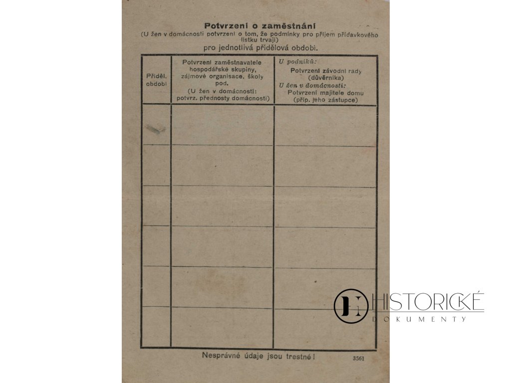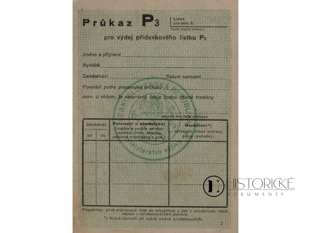 Průkaz úřední pro výdej přídavkového lístku P3, vydaný Ministerstvem výživy republiky Československé, tištěný na papíru tvrdším. Přídavkové lístky P3 náležely osobám, jež práci těžkou konaly a výživy vydatnější potřebovaly, jako byli dělníci v dolech, hutích či při stavbách. V dobách přídělového hospodářství, kdy potraviny na lístky se vydávaly, průkazy tyto rozhodovaly o tom, kdo kolik chleba, masa či tuků obdrží. Ministerstvo výživy bedlivě střežilo, aby příděly spravedlivě rozdělovány byly. Průkaz tento jest svědectvím o časech nedostatku, kdy každý krajíc chleba ceněn byl. Vzácná památka na hospodářství válečné či poválečné Československa