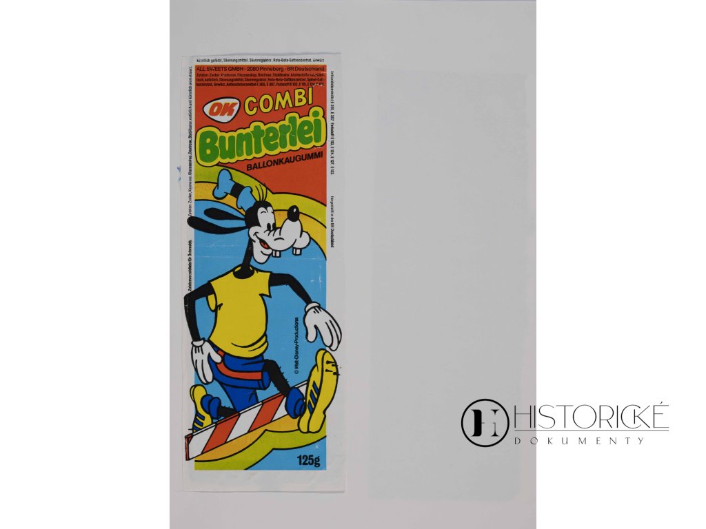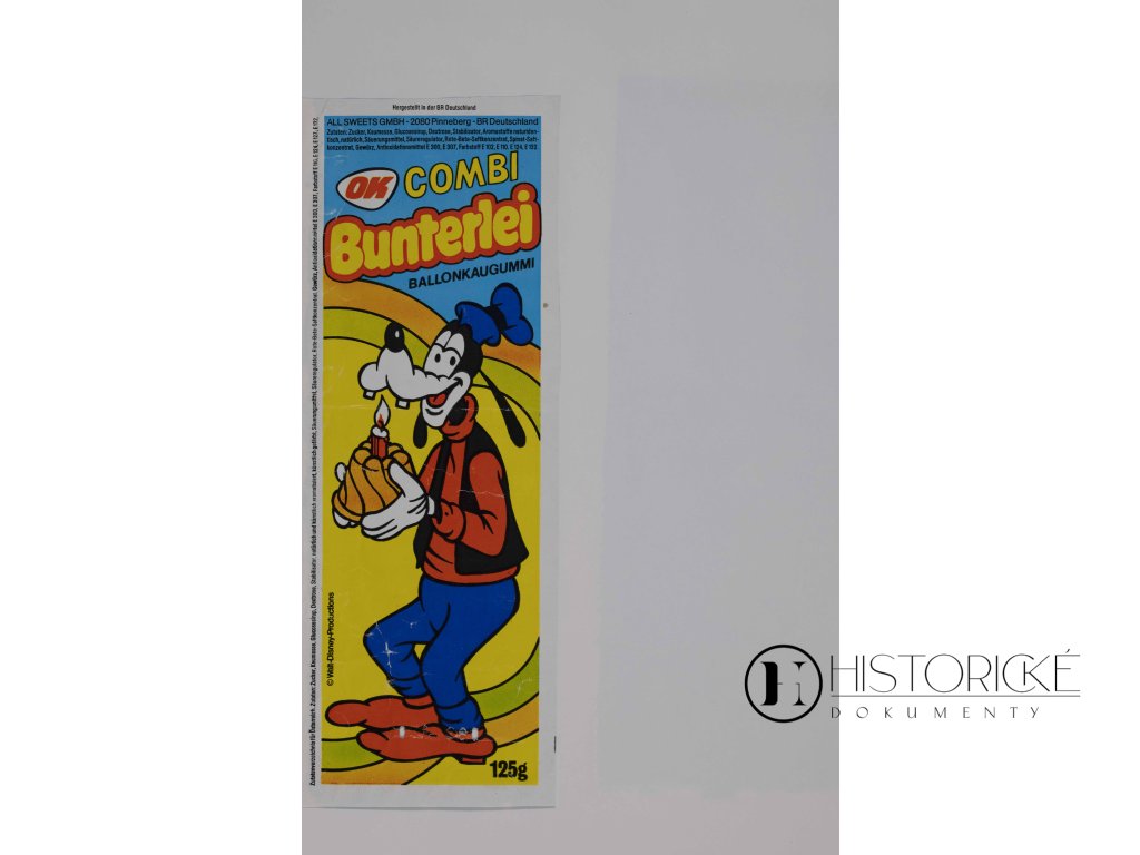 Reklamní etikety žvýkačky balonové, německy Ballonkaugummi, značky Combi Bunterlei, v balení po sto dvaceti pěti gramech. Dva kusy etiket nalepeny jsou na papíře. Žvýkačky balonové těšily se oblibě dětí i mládeže, neboť z nich nafouknouti šlo bubliny veliké a barevné. Slovo Bunterlei značí pestrost a rozmanitost, což na směs příchutí a barev poukazuje. Etikety reklamní sloužily výrobcům k označení zboží svého a lákání zákazníků. Grafika jejich bývala pestrá a veselá, aby oko dětské potěšila. Vzácná kuriozita pro sběratele reklamy cukrovinkářské, obalů historických i památek na sladkosti dob minulých, kdy žvýkačka byla ještě zábavou vzácnou