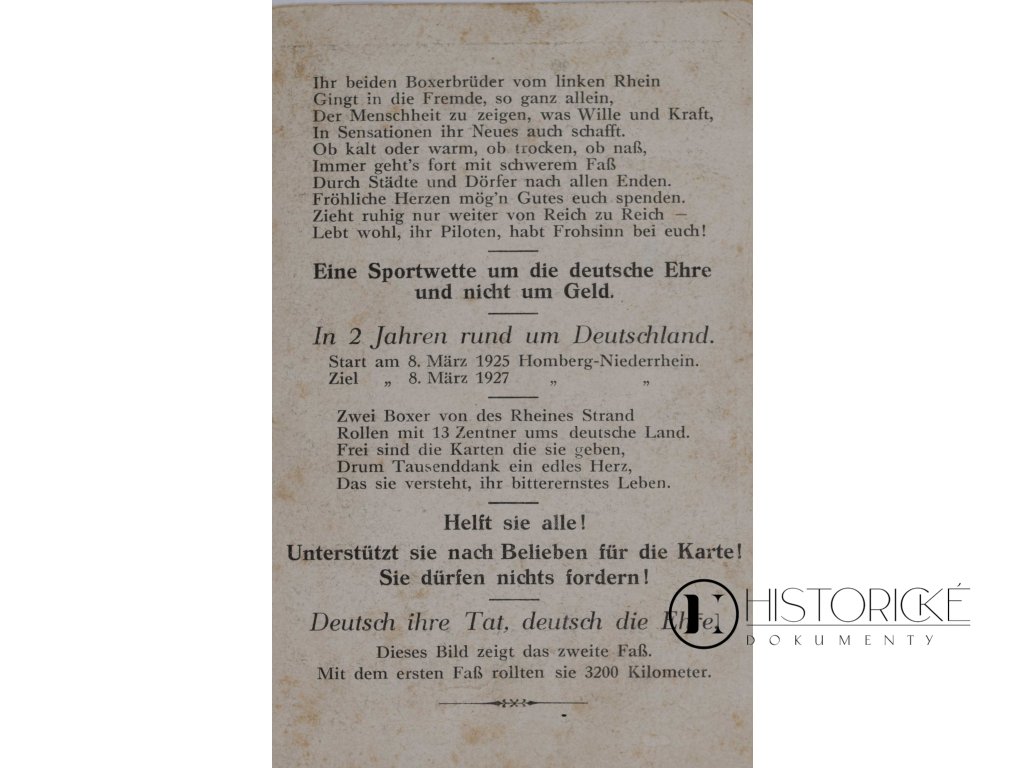 Sportovní sázka to byla pro čest německou, nikoliv pro peníze, trvající od 8. března 1925 do 8. března 1927, kdy z Hombergu na Dolním Rýně vyrazili a celou říši obešli. S prvním sudem 3200 kilometrů urazili. Na líci muži v kloboucích kovbojských u sudu s nápisem „Wir rollen rund um Deutschland" pózují. Rub nese báseň oslavnou a výzvu k podpoře. Vzácná kuriozita pro sběratele pohlednic sportovních i bizarních výkonů lidských z dob výmarské republiky.
