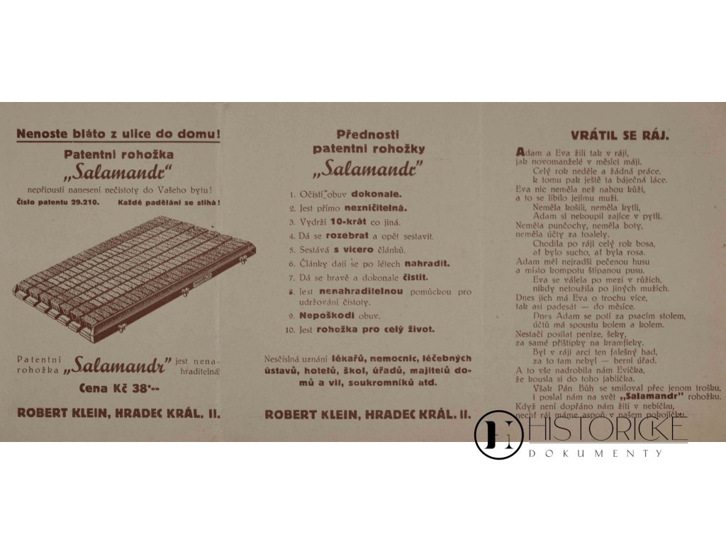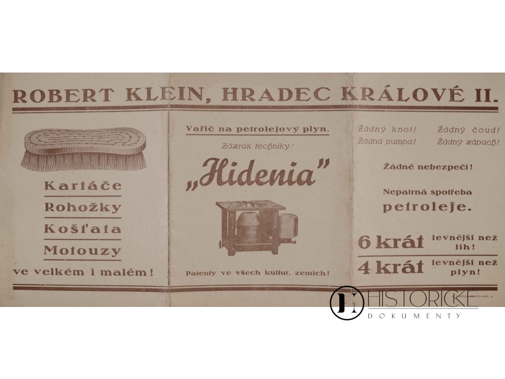 Reklamní nabídka, leták skládací o třech listech, firmy Robert Klein, značky Hidenia, sídlem v Hradci Králové, městě královském při soutoku Labe s Orlicí. Firma tato vyráběla a prodávala kartáče rozmanité, rohožky ke dveřím, košťata na zametání i motouzy k vázání. Zboží kartáčnické náleželo k potřebám každé domácnosti spořádané i dílny řemeslnické, neboť čistota polovinou zdraví jest. Skládačka tištěná nabízí sortiment s cenami a popisy, jak tehdáž zvykem reklamním bývalo. Hradec Králové, centrum kraje východočeského, podnikatelů zdatných hostil. Vzácná kuriozita pro sběratele reklamy historické a tiskovin obchodních.