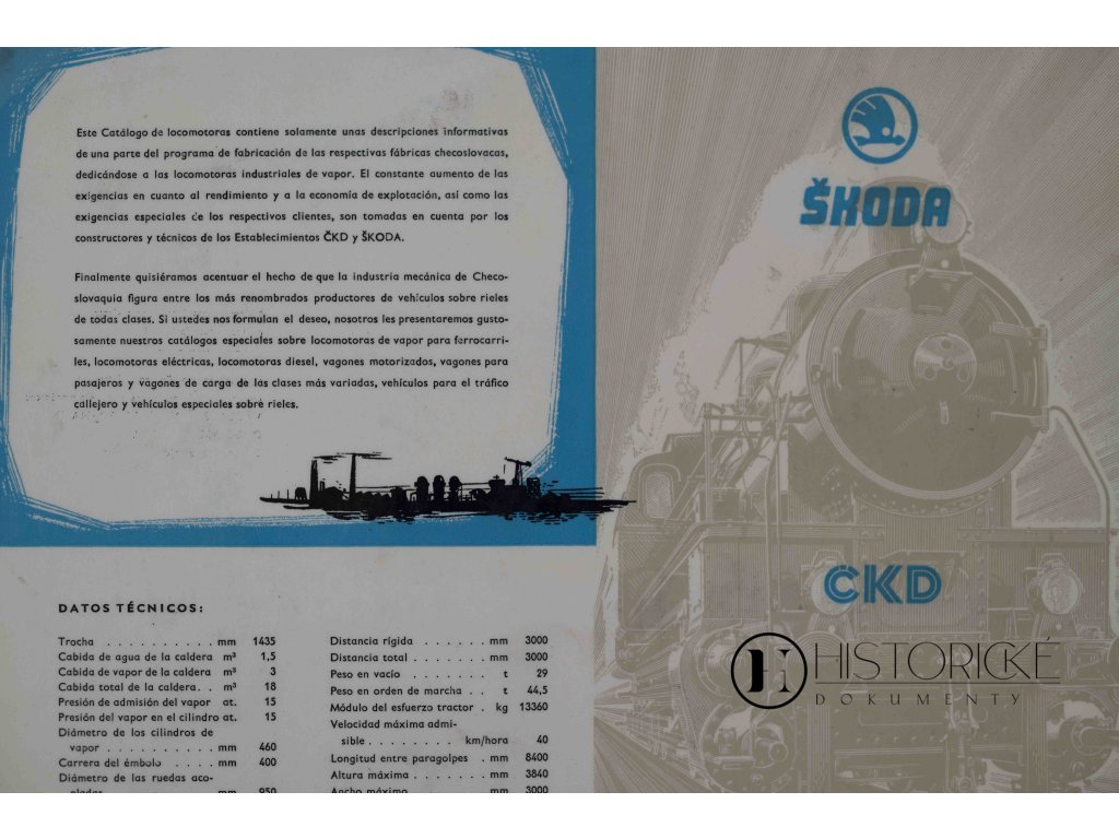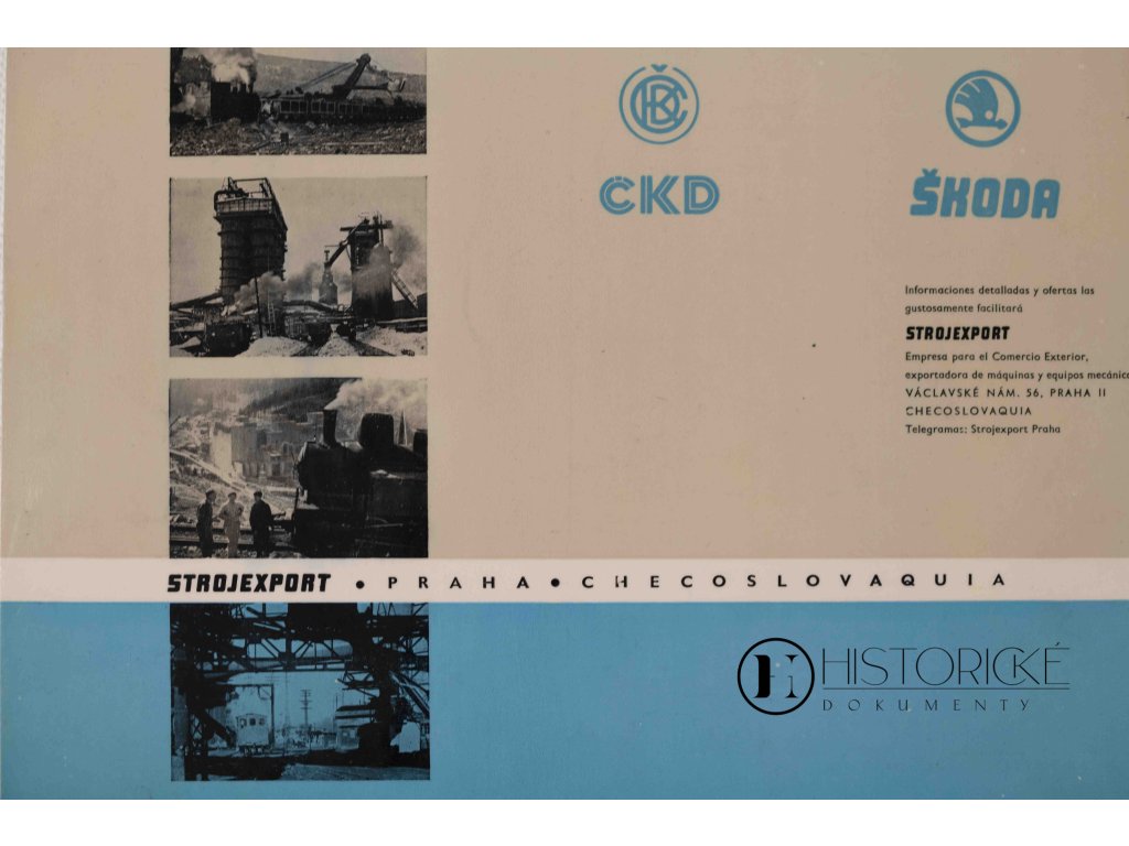 Historický reklamní nosič ČKD, Škoda - Strojexport s názvem "Catalogo de Locomotoras industriales" (Katalog průmyslových lokomotiv), oboustranný tisk na tvrdém kartonu z Prahy, Československo. Jedná se o autentický dokument z oblasti československého strojírenského exportu, pravděpodobně ze šedesátých až osmdesátých let, jenž propagoval československé průmyslové lokomotivy na španělsky mluvících trzích. ČKD a Škoda patřily mezi nejvýznamnější československé strojírenské koncerny s rozsáhlým exportem. Strojexport zastřešoval vývoz strojírenských produktů. Neocenitelná ephemera pro sběratele československých reklamních materiálů a badatele dějin československého strojírenského exportu.