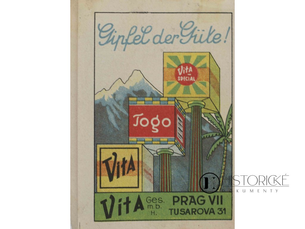 První strana propaguje produkty ViTA Special a Jogo s heslem "Gipfel der Güte!" (Vrchol kvality!) na pozadí alpské scenérie. Uvnitř text pohádky jest. Druhá strana obsahuje ilustrovanou pohádku o princezni Edith s rytířem a hradem. Firma ViTA byla známým výrobcem potravin a nápojů v meziválečném období. Tato reklamní publikace spojuje obchodní propagandu s dětskou literaturou, což bylo typické pro marketingové strategie té doby. Pro sběratele reklamních tiskovin a badatele o dějinách československého průmyslu představuje vzácné svědectví o kreativní reklamě a obchodních praktikách třicátých let