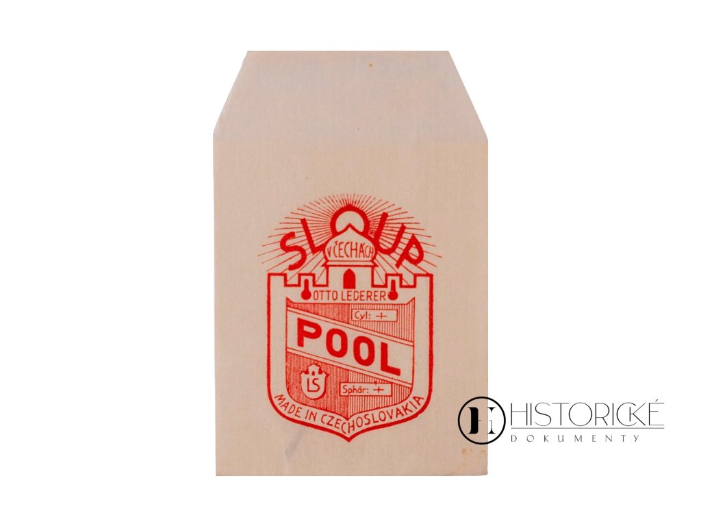 Vskutku zajímavý reklamní sáček firmy Pool z dílny váženého obchodníka Otty Rederera ze Sloupu v Čechách. Tento papírový artefakt, tištěný v prvotřídní kvalitě, nese hrdé označení "Made in Czechoslovakia" a jest cenným dokladem řemeslné zručnosti prvorepublikových tiskařů. Reklamní předmět poskytuje vzácný vhled do propagačních metod našich předků a rozvoje obchodu v mladé Československé republice.