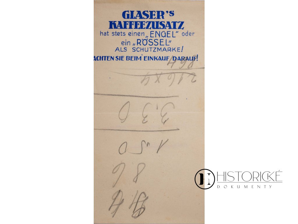 Reklamní účtenka firmy Glaser's Kaffeezusatz (kávová náhražka). Text modrý hlásá, že výrobek vždy nese ochrannou známku "ENGEL" (anděl) nebo "RÖSSEL" (koník). Na rubu tužkou připsány výpočty či poznámky. Dokument pochází z období, kdy káva byla vzácným zbožím a náhražky kávové těšily se oblibě. Stav zachovalý, tisk jasně čitelný, barva modrá nebledlá. Unikátní doklad obchodních praktik v době nedostatku pravé kávy.
