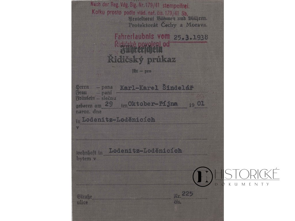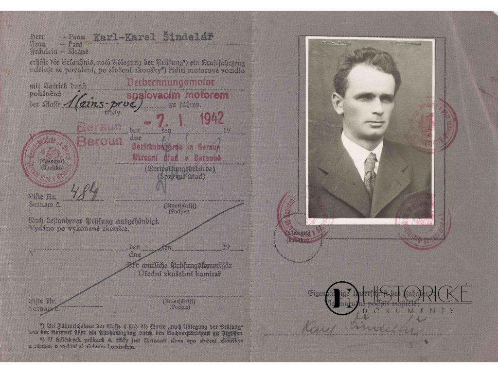 Historický vůdčí list z roku 1942 z Loděnic u Berouna (německy Lodenitz), číslo 225, obsahuje fotografii a razítko na 4 stranách. Jedná se o autentický dokument z období protektorátu Čechy a Morava, jenž svědčí o fungování motoristické legislativy během německé okupace. Řidičský průkaz představoval důležitý dokument opravňující k řízení motorových vozidel v okupovaném území. Loděnice u Berouna používaly během protektorátu německý název. Dokument zachycuje administrativní postupy a kontrolu dopravy za druhé světové války. Neocenitelný materiál pro badatele dějin protektorátu a vývoje dopravní legislativy.