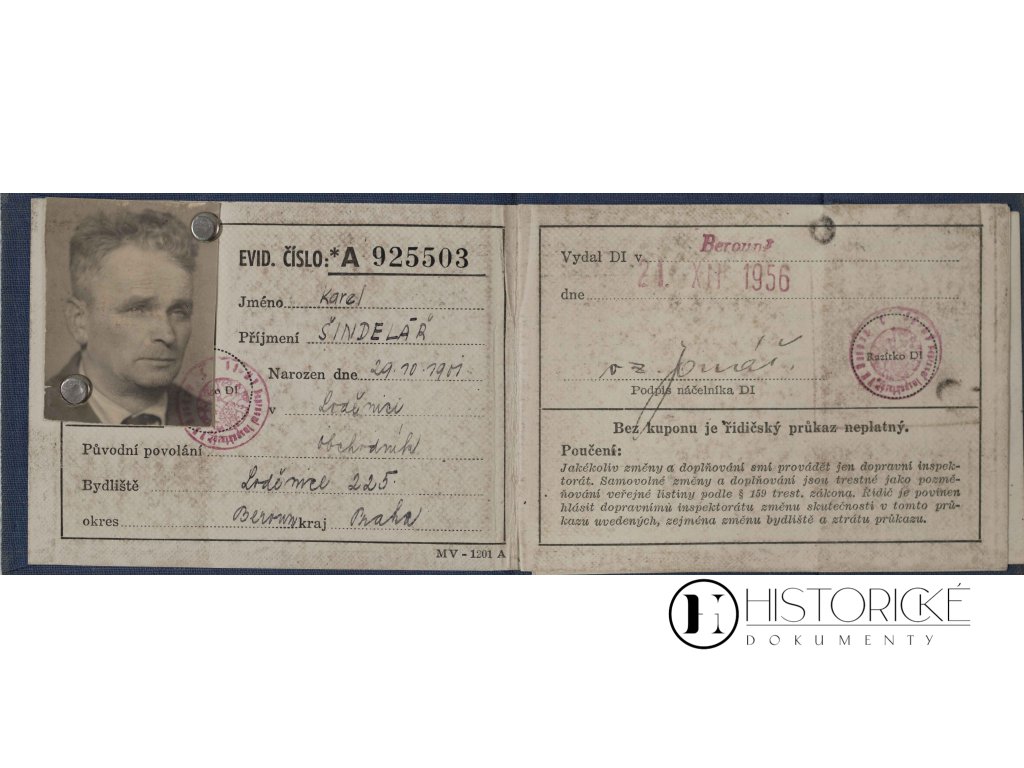 Historický řidičský průkaz z Berouna ze dne 21. prosince 1956, číslo A 925503, v plátěné vazbě na 8 stranách s fotografií a razítkem, přiložen kupon z Oddělení veřejné bezpečnosti. Jedná se o autentický dokument z období socialistického Československa, jenž svědčí o systému udělování řidičských oprávnění ve druhé polovině padesátých let. Průkaz obsahuje osobní údaje, fotografii držitele a razítka příslušných úřadů. Přiložený kupon od VB dokládá administrativní postupy. Neocenitelný materiál pro badatele dějin československého dopravního práva a automobilismu. Zajímavá památka regionální správy Berounska.