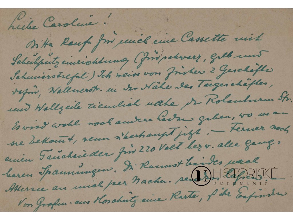 Odesláno z Broumova v období Třetí říše, ofrankováno německou známkou 6 feniků s portrétem říšského prezidenta Hindenburga. Text psán zeleným inkoustem v jazyce německém, oslovení Liebe Caroline uvádí důvěrný obsah od otce podepsaného Papa. Odesílatel zmiňuje počasí, déšť v neděli po včerejším velkém vedru a večerní bouři. Na lícní straně otec žádá dceru o zakoupení pouzdra na čištění bot, ponorného vařiče na 220 voltů a dalších potřeb dostupných v obchodech vídeňských. Zmíněn Attersee a pozdravy z Hoschütz. Pohlednice dokládá běžnou rodinnou komunikaci aristokracie v pohnutých třicátých letech.