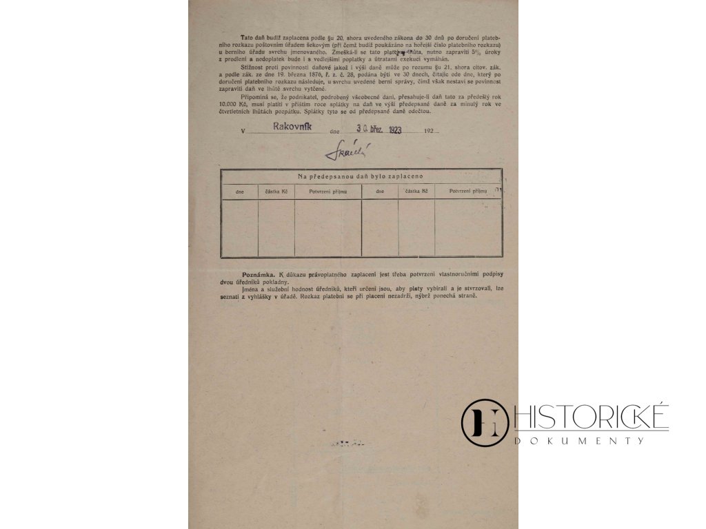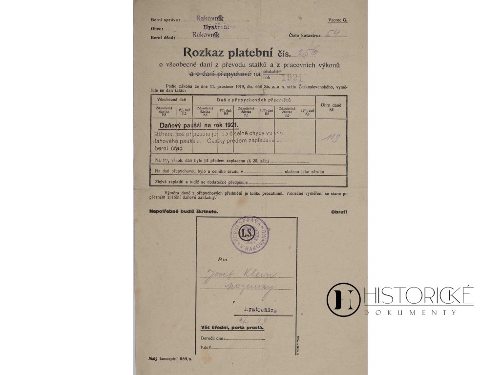 Úřední listina správy berní, rozkaz platební číslo 256, vydaný pro obec Bratronice v okresu Rakovnickém, týkající se daňového paušálu na rok 1921. Dokument obsahuje podrobné vyčíslení daně, jíž poplatník povinen jest odváděti do pokladny státní. Listina opatřena jest úředním razítkem i podpisem berního úředníka. První léta republiky Československé přinesla nové pořádky daňové a tento dokument jest toho věrným svědectvím. Paušální daň sloužila k zjednodušení výběru u menších živnostníků a hospodářů. Vzácná památka na berní správu prvorepublikovou, vhodná pro sběratele úředních listin i regionální badatele rakovnické.