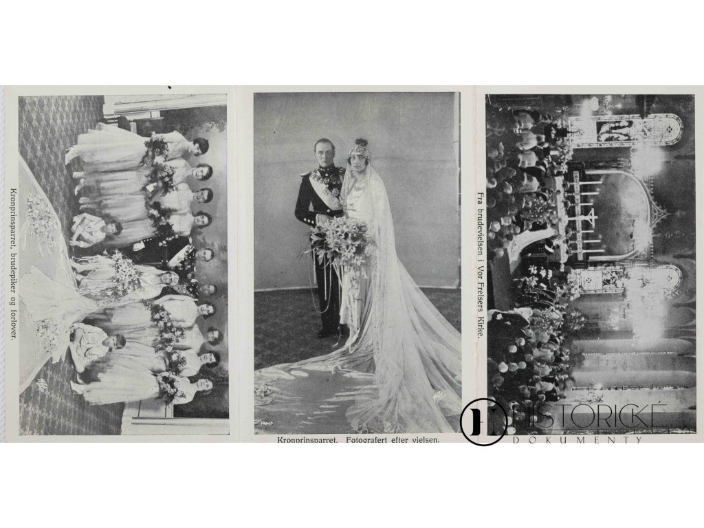 Vzácná sada deseti pohlednic z královské norské svatby korunního prince (Norges Kronsprinsor) a slavností svatebních v Oslu (fra Bryllupsfestlighetene i Oslo). Pohlednice uloženy jsou v původním obalu a jsou nenadepsané a neprošlé poštou, což je činí zvláště vzácnými jako kompletní nepoužitý soubor. Sada pravděpodobně pochází ze svatby korunního prince Olaava a princezny Märthy v roce 1929, či jiné významné královské události norské. Pohlednice zachycují slavnostní momenty, portréty královského páru a průvody, což dokládá velkolepost skandinávských monarchií. Pro sběratele královských memorabilií, filatelie a badatele o dějinách severských zemí představuje vzácné svědectví o životě a ceremoniích dvorů královských. Kompletní sada v původním stavu - unikátní historická památka.