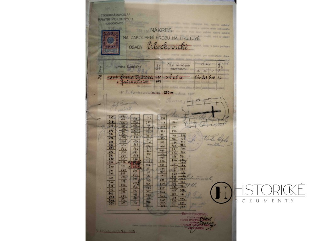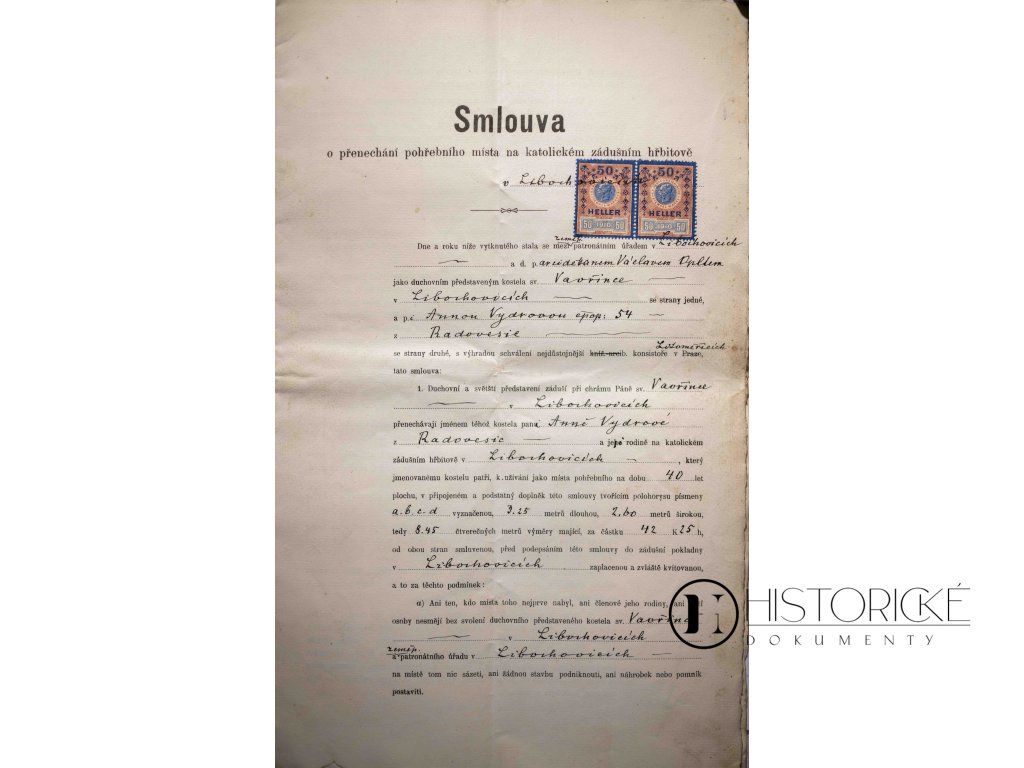 Smlouva, přenechání pohřebního místa, Libochovice, 1918