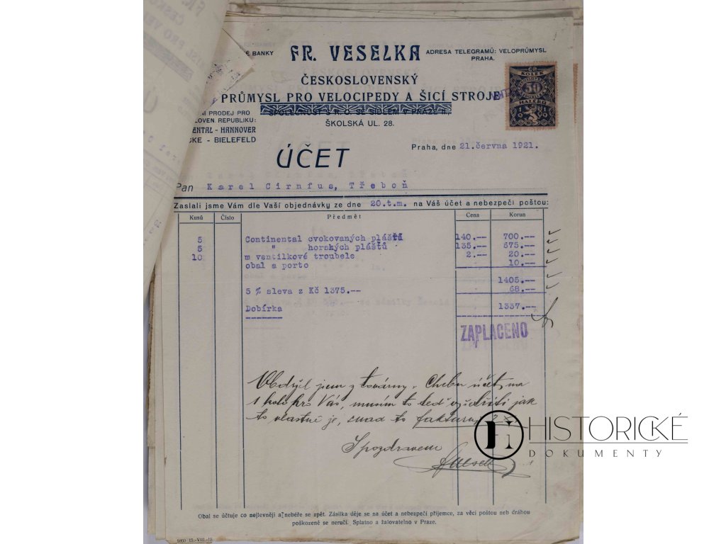 Soubor patnácti účtů firmy Františka Veselky, československého průmyslu pro velocipedy a šicí stroje, vystavených roku 1921. Velocipedy čili jízdní kola a šicí stroje náležely k výrobkům moderním, jež měnily život domácností i způsob dopravy v mladé republice. Firma Veselkova reprezentuje podnikatelský elán českého průmyslu v prvních letech státu československého, kdy domácí výroba nahrazovala dovoz zahraniční. Účty provedeny strojopisem, opatřeny razítky firemními a doplněny poznámkami ručními. Přiloženy poštovní složenky k úhradě fakturovaných částek. Dokumenty slepeny v levém horním rohu, což odpovídá dobové praxi účetní evidence. Soubor zachován kompletní, papír kvalitní. Unikátní konvolut dokládající obchodní činnost průmyslu strojírenského