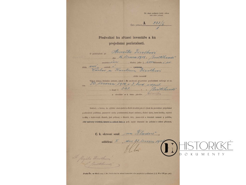 Soudní listina c. k. okresního soudu v Kladně ze dne 23. června roku 1906, číslo jednací A 223/6. Dokument obsahuje předvolání ku zřízení inventáře a ku projednání pozůstalosti, tedy úřední obsílku pro dědice a účastníky řízení pozůstalostního. Inventář sepisoval se za přítomnosti dědiců, soudního komisaře a odhadců, kteří oceňovali movitosti i nemovitosti zůstavitelovy. Projednání pozůstalosti určovalo dědické podíly dle zákona či závěti a končilo vydáním odevzdací listiny. Kladno v oné době rostlo v průmyslové centrum, jehož obyvatelé nabývali majetků nemalých. Soubor obsahuje dvě listiny související s týmž řízením. Papír úřední, razítka a podpisy čitelné. Vzácný doklad soudní praxe pozůstalostní monarchie.