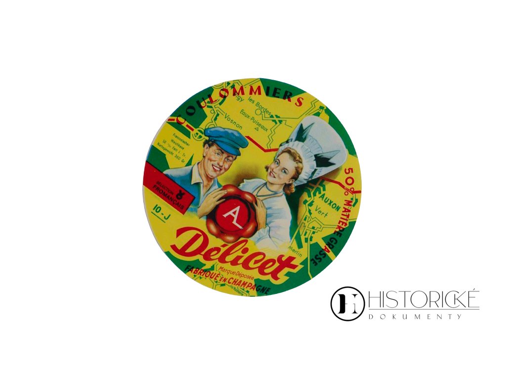 Půvabná etiketa sýrová z kraje šampaňského, hlásající výrobek vybraný Délicet A - Coulommiers o tučnosti 50 setinných dílův, jak nápis "50% Matière Grasse - Fabriqué en Champagne" dokládá. Coulommiers, sýr měkký s pláštěm bílým plísňovým, býval od věkův bratrancem slavného Brie, leč menší a jemnější chuti. Označení "Délicet A" svědčí o jakosti prvotřídní. Etiketa umělecky provedená připomíná časy, kdy mlékárny francouzské každý výrobek značkou krásnou opatřovaly. Skvost pro sběratele etiket gastronomických i milovníky sýrařské tradice šampaňské.
