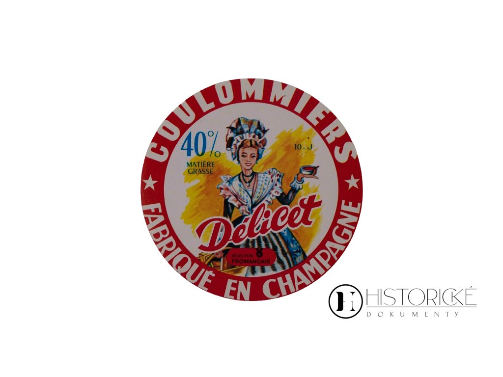 Půvabná etiketa sýrová z kraje šampaňského ve Francii slavné, hlásající výrobek ušlechtilý Délicet - Coulommeiers. Nápis "Fabriqué en Champagne" svědčí o původu pravém z krajiny proslulé nejen vínem šumivým, ale též sýry měkkými vyhlášenými. Coulommiers, bratranec sýra Brie věhlasného, býval od věkův pochoutkou labužníkův i stolův panských. Etiketa zdobená tiskem jemným připomíná časy, kdy každý výrobek mlékárenský opatřen býval značkou tovární umělecky provedenou. Klenot pro sběratele etiket potravinářských či milovníky gastronomie francouzské.