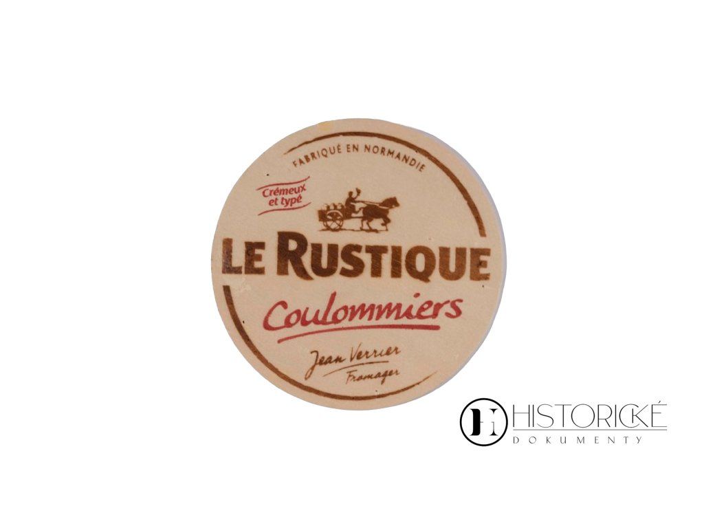 Dřevěná sýrová etiketa francouzského sýra La Rustique, Coulommiers, s označením Fabriqué en Normandie. Kulaté dřevěné víčko sýrové bedýnky jest ozdobeno typickým venkovským motivem normandské krajiny a jest dokladem tradiční francouzské mlékárenské kultury, v níž obal sám o sobě jest výtvarným dílem. Coulommiers — měkký sýr normandského původu — proslul po celé Francii i světě. Dřevěné sýrové etikety jsou dnes vyhledávaným sběratelským artiklem, jenž stojí na pomezí gastronomické historie, lidového umění a francouzské venkovské tradice. Stav pěkný.