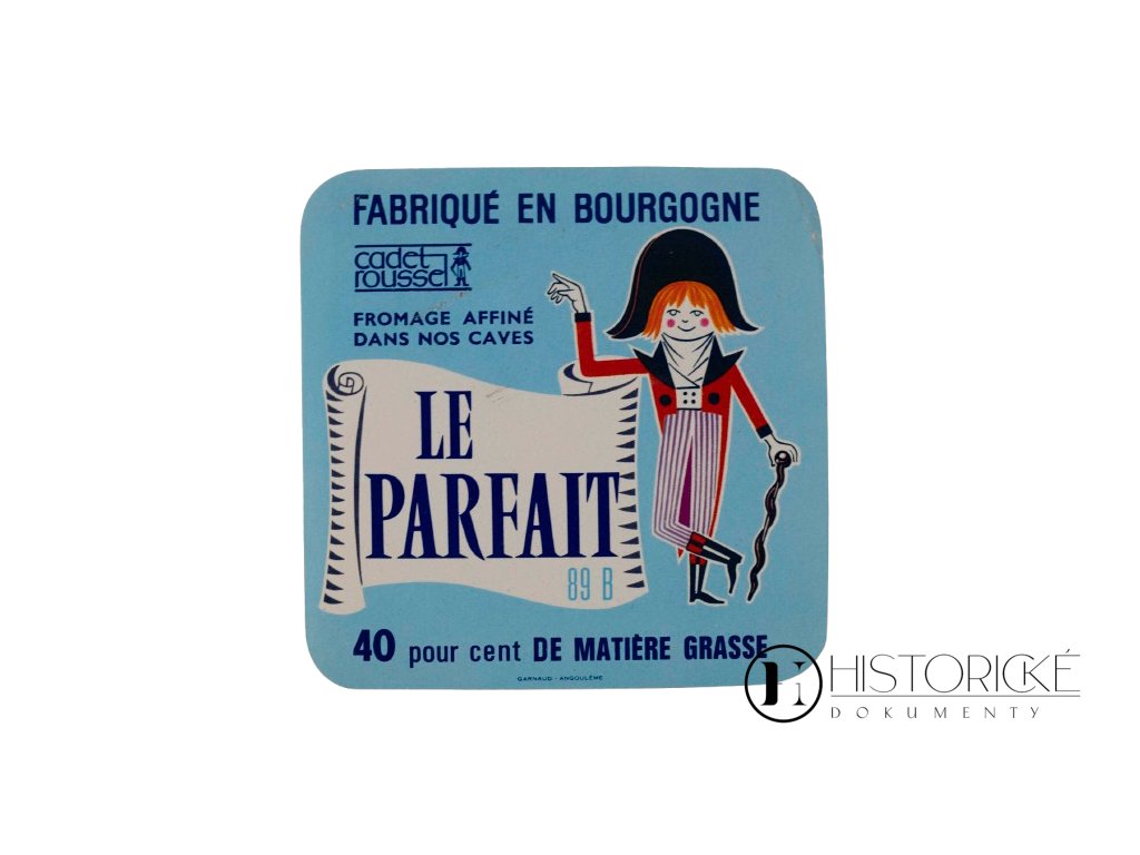 Etiketa sýrová z Burgundska francouzského, ohlašující výrobek znamenitý Le Parfait (Dokonalý) o tučnosti 40 setinných dílův, jak nápis "40% de Matière Grasse - Fabriqué en Bourgogne" zvěstuje. Sýr burgundský tento vyráběn býval v krajině proslulé nejen víny červenými výbornými, ale též sýrařstvím tradičním. Jméno Le Parfait svědčí o pýše mlékárníků francouzských na jakost výrobkův svých. Etiketa umělecky zdobená představuje éru, kdy každý produkt mlékárenský opatřen býval značkou krásnou. Lahůdka pro sběratele etiket gastronomických i milovníky tradic burgundských.