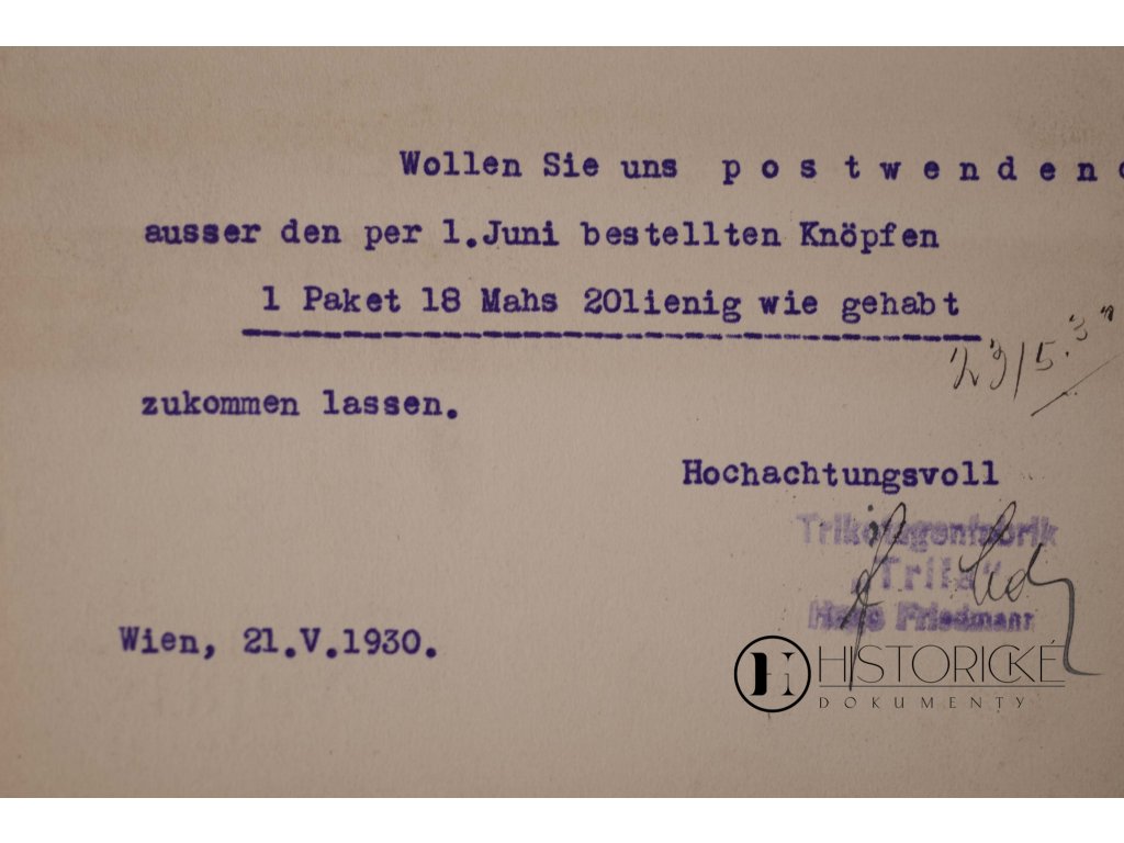 Telegram z Vídně, dne 21. května léta Páně 1930 firmou Trifa zaslaný, známkou poštovní opatřený, továrně na knoflíky Müller & Fritsche ve Šluknově adresovaný. Jest to artefakt nadmíru cenný, dokumentující obchodní styky rakousko-československé v době první republiky a svědčící o rozvoji průmyslu textilního a galanterního.