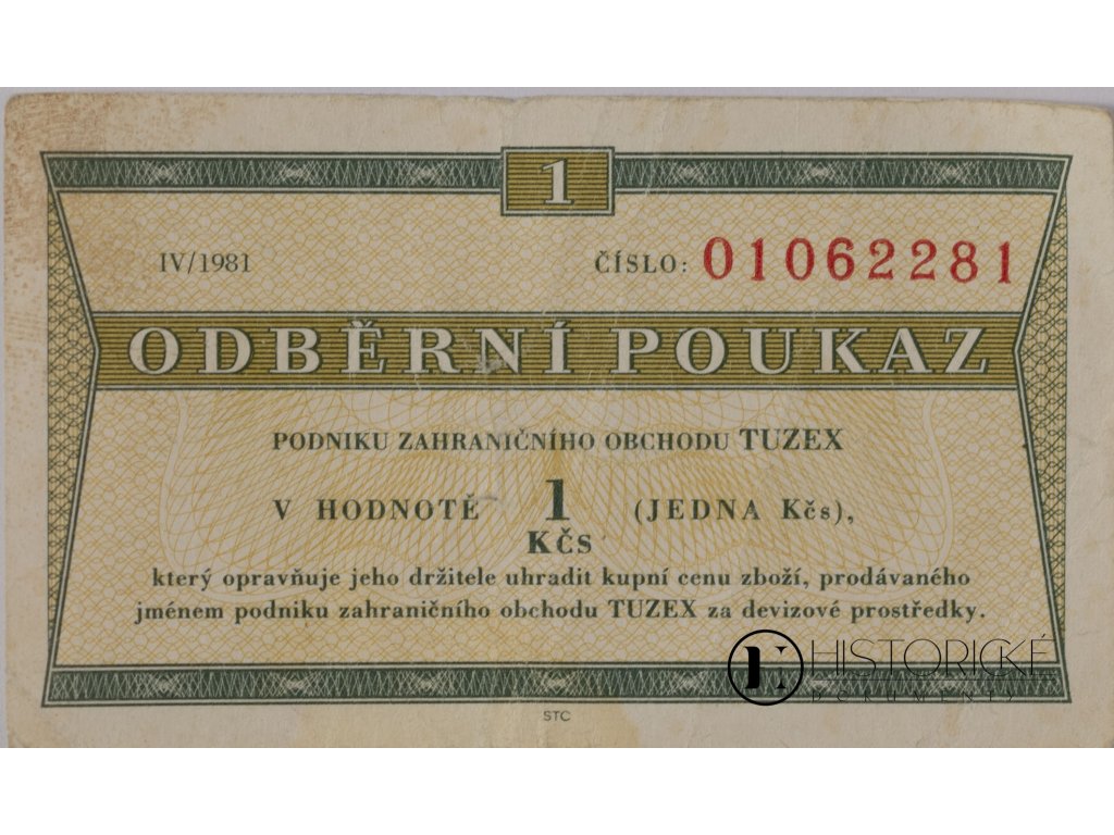Tuzexová poukázka v hodnotě jednoho bonu (1 tuzexová koruna československá) z osmé emise z let 1980-1988, nesoucí sériové číslo 01062281a označení IV/1981. Tento platební prostředek, používaný v síti obchodů Tuzex v letech 1957-1989, představuje významný doklad o způsobu distribuce zahraničního zboží v období socialistického Československa