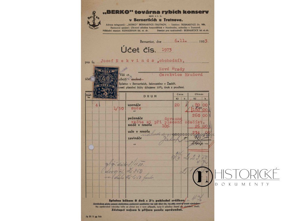 Účet továrny rybích konserv Berko v Bernaticích u Trutnova z roku 1933, adresovaný panu Josefu Nekvindovi do Nových Hradů, opatřený kolkovou známkou v hodnotě čtyřiceti haléřů. Továrna Berko patřila v meziválečném období k zajímavým podnikatelským počinům v průmyslovém pohraničním kraji Trutnovském, kde se rybí konservy těšily stálé poptávce. Dokument jest pozoruhodným hospodářským svědectvím z doby, kdy Československo procházelo nejhlubším propadem velké hospodářské krize. Stav listiny dobrý, kolek čitelný a zachovalý.