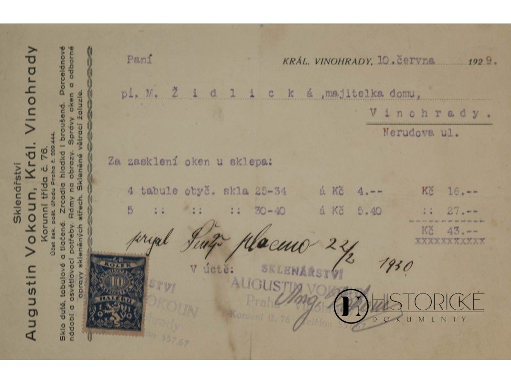 Účetní listina z dílny mistra Augustina Vokouna, sklenáře a leptače skla na Královských Vinohradech, vystavená dne 22. Února léta 1931. Dokument psán jest rukou a opatřen kolkem ve výši dvaceti haléřů. Řemeslo sklenářské a zvláště umění leptání skla náleželo k živnostem uměleckým, jimiž Vinohrady, čtvrť měšťanská a zámožná, oplývaly. Leptané sklo zdobívalo dveře vil, výkladce obchodů i okna kaváren proslulých. Mistr Vokoun tvořil ornamenty jemné i nápisy ozdobné technikou, jež trpělivosti a zručnosti vyžadovala. Vzácný doklad uměleckého řemesla sklenářského v dobách první republiky Československé